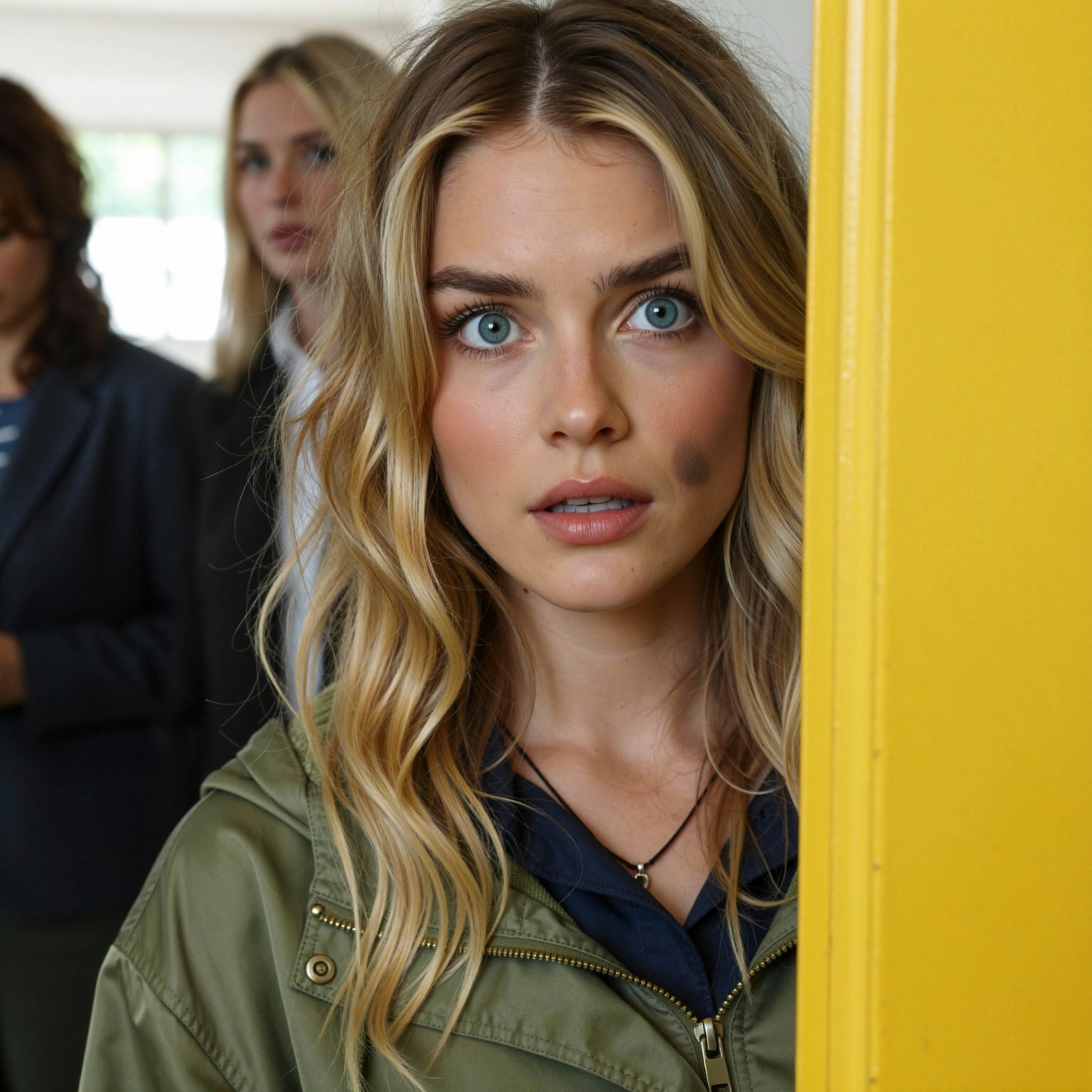 ? Grooming: Her hair is styled | Enhanced Prompt: A photorealistic medium shot, tightly framed on the face of a young adult Caucasian woman, estimated age 20-25, with a slender build and fair, slightly tanned skin. Her medium blonde, wavy hair falls around her shoulders, and her wide, expressive blue eyes show surprise or concern with furrowed eyebrows; a faint dark smudge marks her left cheek. She wears a light olive green nylon hooded jacket with a visible zipper over a dark blue collared garment, accessorized by a thin dark necklace with a small pendant. The composition is slightly off-center to the right, utilizing the rule of thirds, framed by a strong vertical yellow door frame on the right, creating enclosure. The background is softly blurred with creamy bokeh, showing two other figures partially visible. The aesthetic is clean, with very low film grain, captured with a 50mm prime lens at a shallow aperture (f/2.8-f/4) under bright, clean ambient lighting, emphasizing sharp focus on her features and a smooth falloff into the background. SHOT: