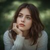 ? Description: A Caucasian young adult woman, estimated age 20-25, with a slender build. Her skin tone is fair with a slight tan. Her hair is medium blonde, wavy, and styled with volume, falling around her shoulders. Her facial features include wide, expressive blue or green eyes, a slightly upturned nose, and full lips. She has prominent eyebrows that are furrowed, conveying surprise or concern. A faint dark mark or smudge is visible on her left cheek.