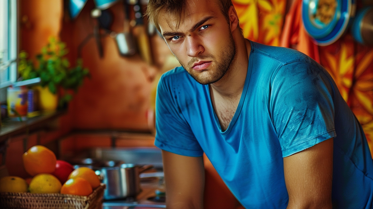 Из кухни вышел мужчина. Он посмотрел на Олега и сказал.