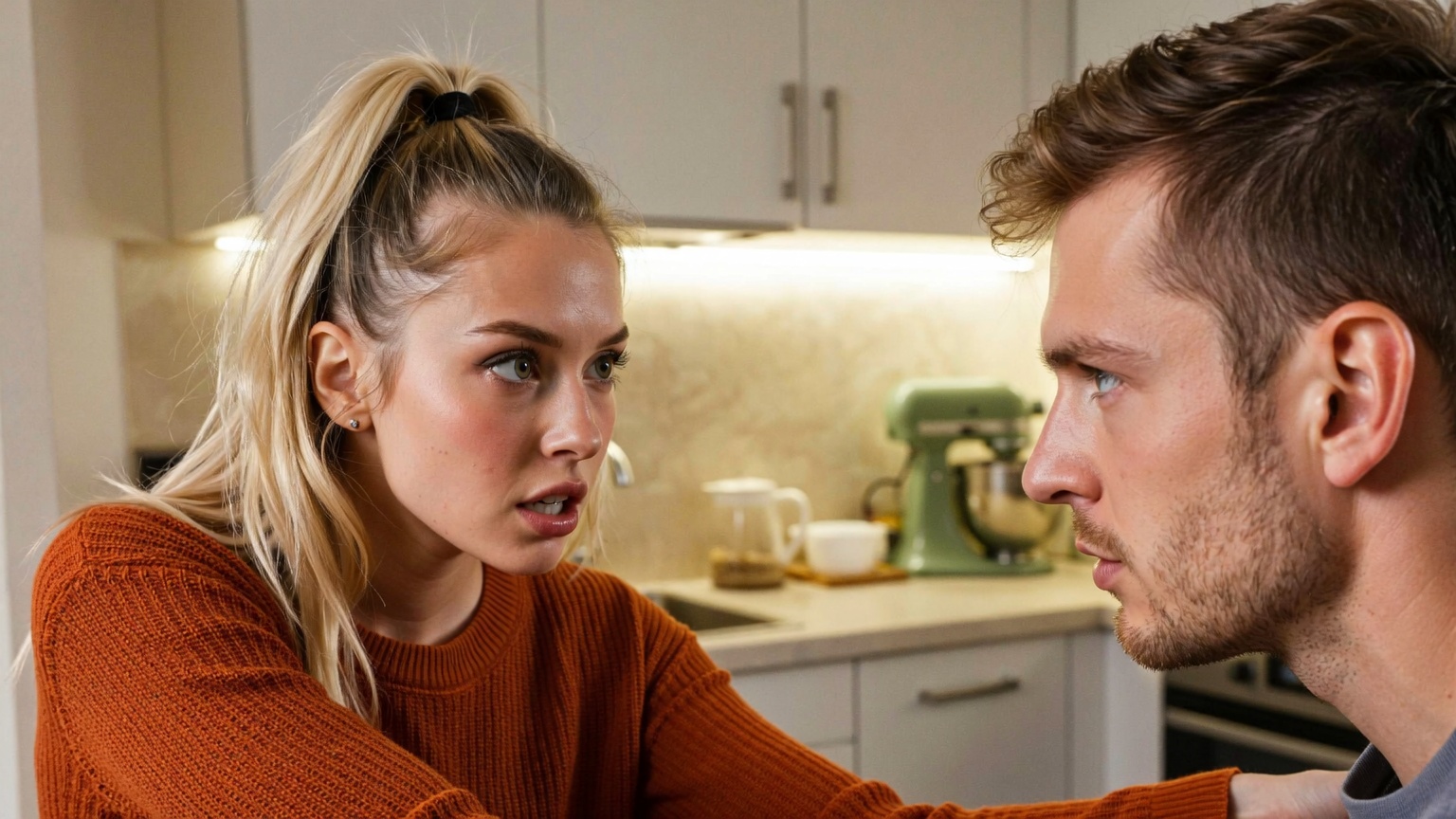 ? Wardrobe: The female subject is wearing a rust-colored, possibly knitted, long-sleeved sweater or top. The male | Enhanced Prompt: A photorealistic medium shot, tightly framed on the faces of two young adults engaged in an intense, silent confrontation, positioned slightly off-center to the left and right respectively. The female subject, late teens, has fair skin, blonde hair in a ponytail, and wide eyes, wearing a rust-colored knitted long-sleeved top, her expression showing slight agitation. The male subject, early twenties, has fair skin, short light brown hair, and stubble, his gaze serious and intense. The scene is a domestic kitchen setting, with the background softly blurred into creamy bokeh, suggesting cabinets and appliances. The lighting is soft and diffused, likely from an unseen window, creating a shallow depth of field (f/2.8) that keeps the subjects’ eyes razor-sharp. The image possesses a clean, high-detail aesthetic with minimal, fine digital grain, captured with a 50mm prime lens for natural perspective. SHOT: