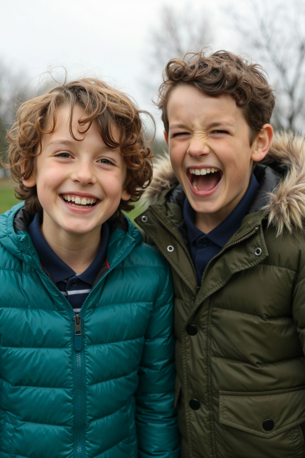 * Boy on the right: Wearing a khaki or olive green puffer jacket with a brown lining and a fur-trimmed hood. The jacket has a prominent zipper with a metallic pull. A dark blue collared shirt is visible underneath, | Enhanced Prompt: A photorealistic medium shot capturing the upper torsos and heads of two joyful young Caucasian boys, aged 8-12, with light brown curly hair and medium-toned skin, positioned slightly off-center to the right. The boy on the left offers a closed-mouth smile, wearing a teal quilted puffer jacket over a dark blue striped collared shirt, while the boy on the right exhibits a wide, open-mouthed laugh, clad in an olive green puffer jacket with a fur-trimmed hood over a dark blue collared shirt. The scene is illuminated by soft, diffused natural daylight, suggesting an overcast or shaded environment, creating a clean image with virtually no film grain. The composition utilizes a shallow depth of field, achieved with an 85mm prime lens at f/2.8, resulting in creamy bokeh that isolates the subjects. The focus is critically sharp on their expressive faces, emphasizing their joyful energy in this optically clean portrait. SHOT: