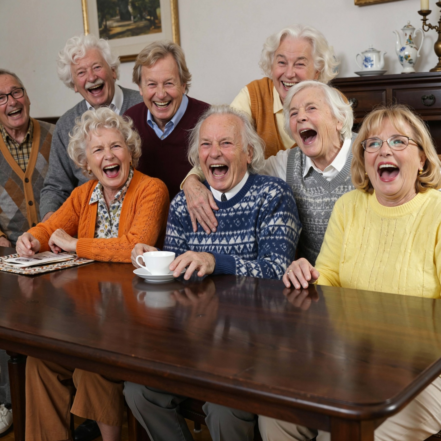 ? Location: Indoor setting, likely a dining room or living room. The decor suggests a traditional or vintage aesthetic, with dark wood | Enhanced Prompt: A photorealistic medium shot capturing a group of six elderly Caucasian individuals, appearing late seventies to eighties, clustered around a dark wooden table in a traditional indoor setting, likely a vintage dining room. The subjects, all displaying wide, open-mouthed expressions of genuine laughter with visible teeth, are arranged slightly asymmetrically, with the table edge acting as a horizontal leading line. Subject 3 holds a white teacup and saucer. They wear casual, textured knitwear: orange cardigan, blue patterned sweater, grey patterned vest, and yellow sweater. The scene is illuminated by bright, clean indoor lighting, suggesting low ISO conditions, resulting in minimal digital noise and sharp focus primarily on their animated faces. A moderate depth of field keeps the background softly blurred, showing dark wood decor, while slight barrel distortion from a wider lens subtly curves the edges. SHOT: