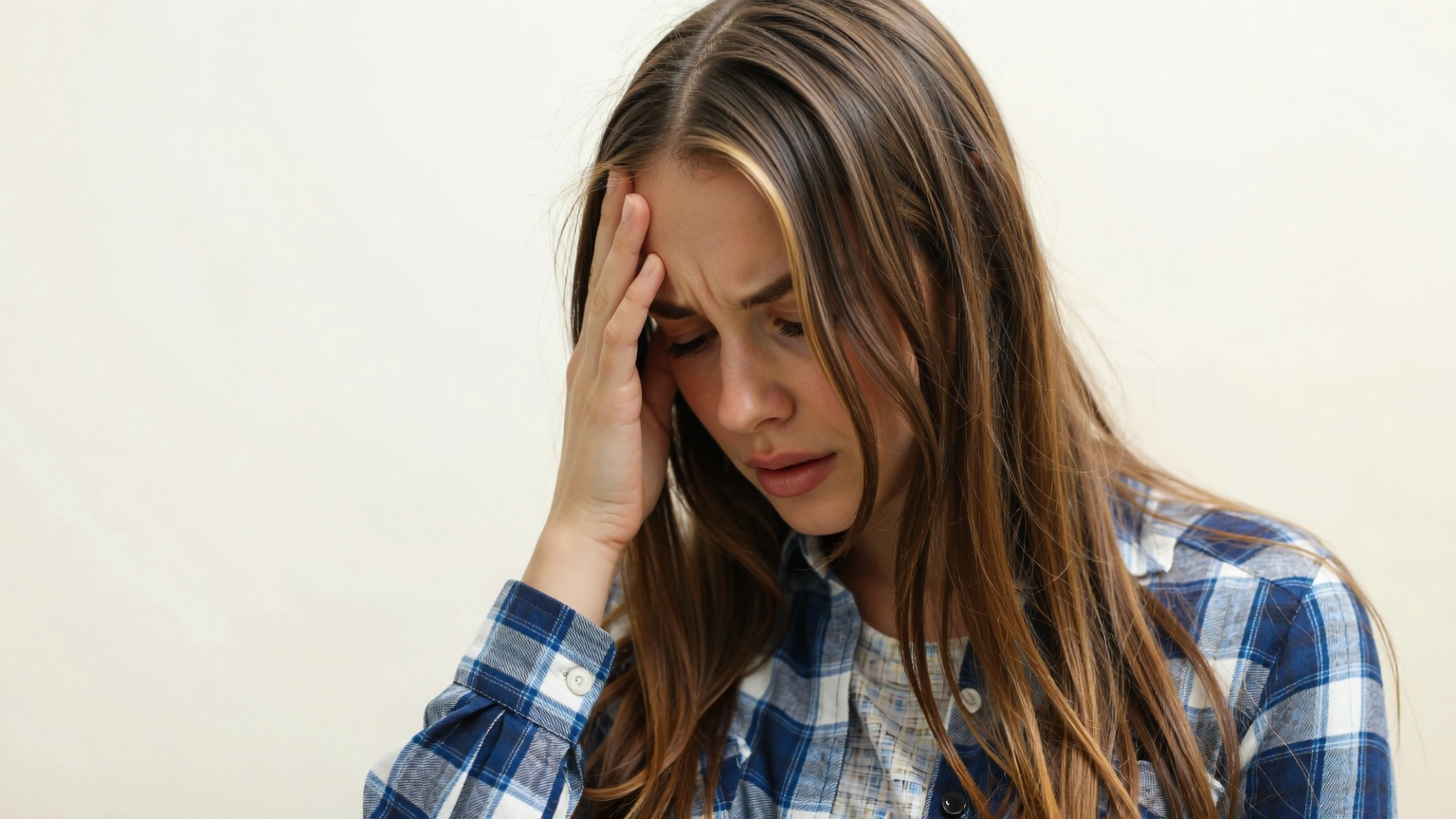 ? Composition: Medium shot, framed slightly off-center to the right, with the subject’s head and shoulders filling the majority of the frame. The subject’s face is angled slightly away from the camera, with her right hand pressed against her forehead. The composition emphasizes the subject’s discomfort and introspection. Negative space is present to the left and top of the frame, creating a sense of isolation.
