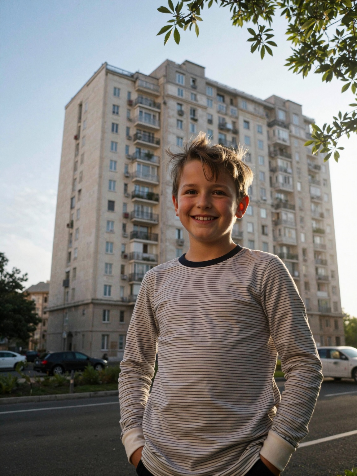 • Composition: Full-body shot of a young boy positioned slightly off-center to the right, occupying the lower-middle portion of the frame. The camera is angled upwards, creating a dramatic perspective. The boy’s stance, with hands in pockets, is casual and confident. The imposing apartment building behind him acts as a strong vertical element, contrasting with the horizontal lines of the balconies. The leaves of a plant in the upper right corner frame the scene, adding a natural element and leading the eye towards the subject.