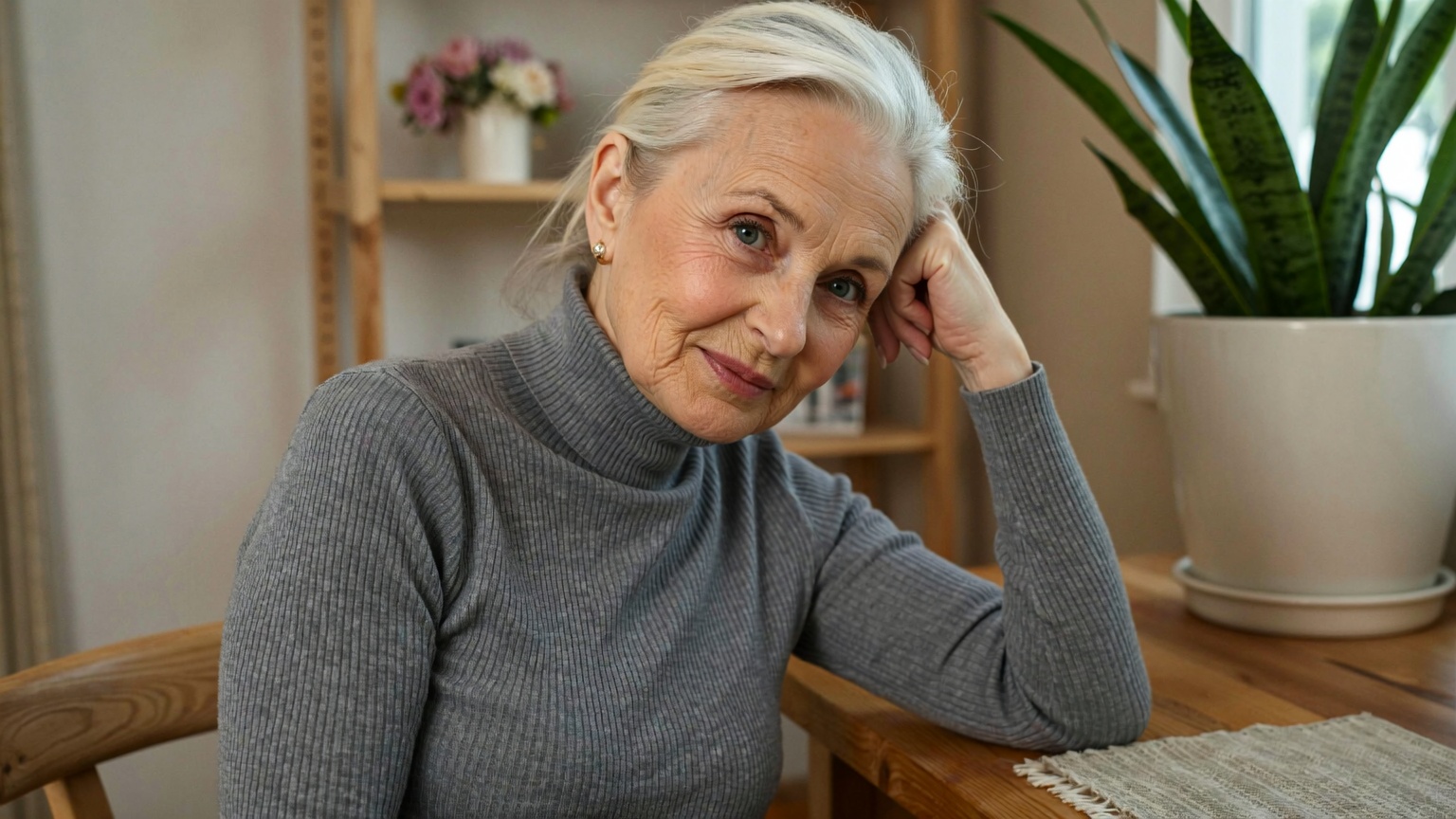 ? Grooming: Her hair is neatly styled and appears clean. No visible makeup. | Enhanced Prompt: A realistic medium shot portrait of an elderly Caucasian woman in her late seventies, featuring delicate features, fair skin with visible age lines, and short, neatly pulled-back gray hair. She is wearing a high-necked, long-sleeved sweater in a muted medium gray with a fine ribbed texture. Her body is angled slightly left, but her face turns directly to the camera, her left hand resting contemplatively on her cheek with her elbow on a wooden table. The scene is indoors, utilizing natural window light which acts as the key light, creating a moderate depth of field (f/2.8 to f/4) that softly blurs the background elements like a plant pot and shelf, achieving a pleasing bokeh. The composition is centered, with the table edge providing a strong horizontal line. The image is clean, sharp on the face, with a warm, slightly pensive color tone. Photorealistic, hyperdetailed. SHOT: