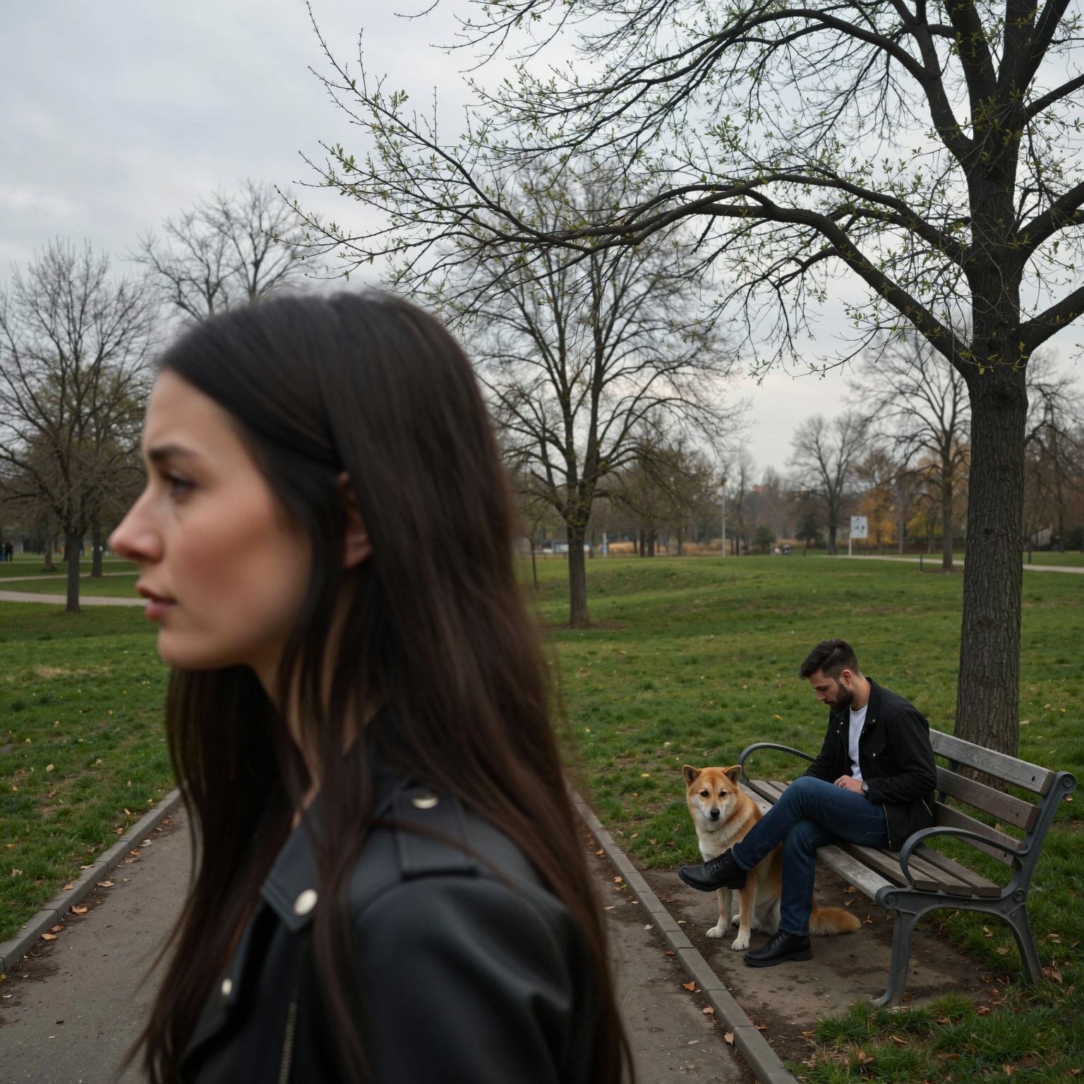 * Mid-ground Man: Appears to be a young adult to adult male, with a medium build. He has short, dark brown hair and a beard. His skin tone is fair. He is looking down towards the dog. His expression is somber or pensive. | Enhanced Prompt: A realistic medium shot capturing a contemplative park scene under an overcast sky. In the foreground left, a young adult woman with fair skin and long, straight dark brown hair walks away from the camera, slightly out of focus, her profile showing a neutral expression as she looks left. In the mid-ground right, a man with short dark hair and a beard sits on a park bench looking down somberly at his medium-sized dog beside him. The composition uses the pathway as a diagonal leading line, loosely adhering to the rule of thirds, with bare tree branches occupying the negative space above. The aesthetic features diffused, soft lighting typical of an overcast day, resulting in a slightly desaturated, atmospheric color tone. The moderate depth of field, achieved with an estimated f/2.8 aperture, creates creamy bokeh behind the man and dog, while the image maintains a clean texture with minimal film-like grain. Photorealistic, cinematic. SHOT: