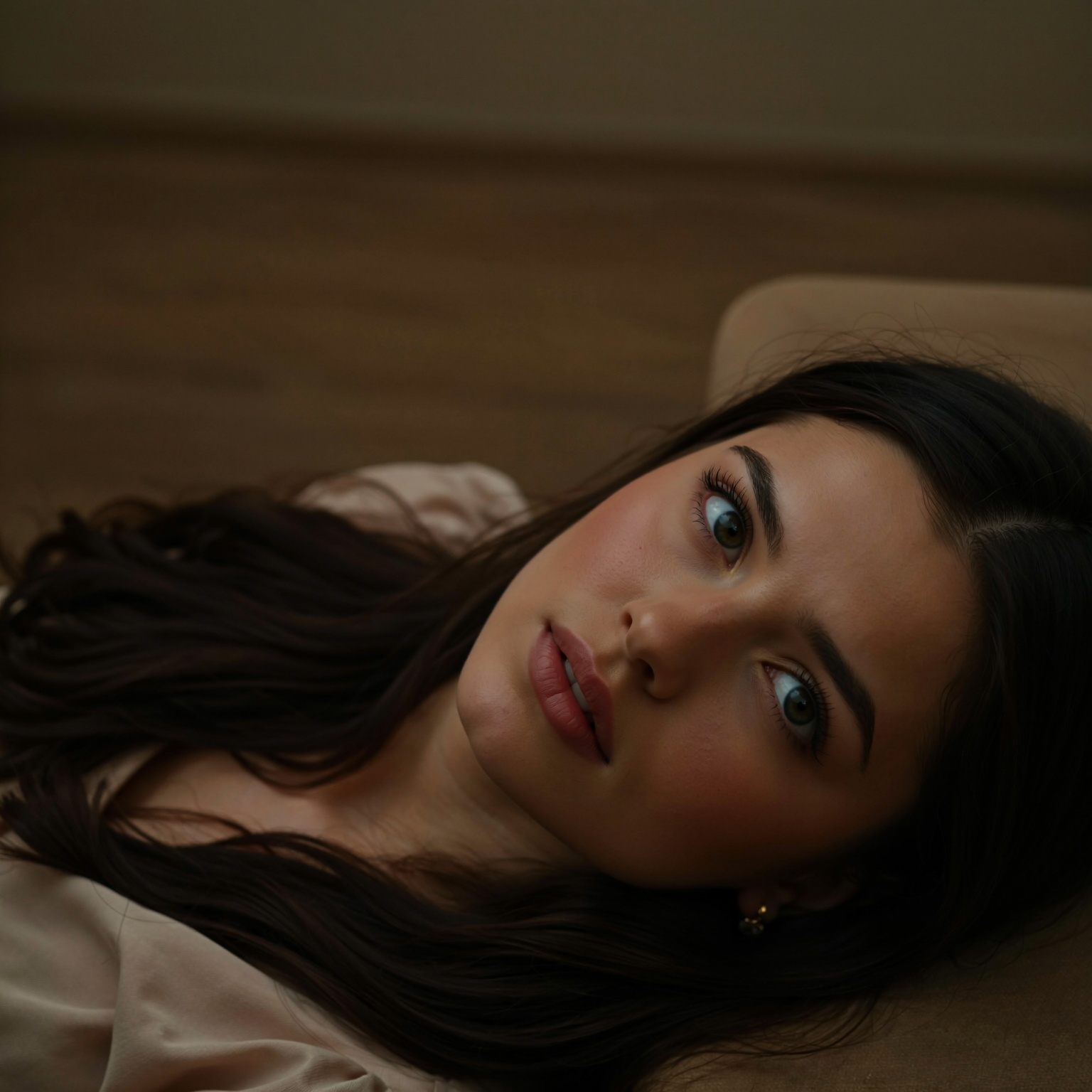 ? Wardrobe: She is wearing a light-colored garment, possibly a shirt or blouse, made of a soft fabric | Enhanced Prompt: A realistic medium close-up shot of a young adult female in her early twenties, her dark brown hair styled away from a face showing deep thought and vulnerability, with slightly parted lips and a subtle furrow in her brow as her gaze directs upwards and away from the viewer. She wears a light-colored, soft fabric garment. The scene is an indoor, low-light setting, utilizing dim, controlled lighting that creates a smooth texture with minimal film grain and sharp focus on her eyes. The composition is tightly framed, with her head tilted back resting on a surface, establishing a strong diagonal line. Aesthetic control is achieved with a shallow depth of field (f/2.8 to f/4 equivalent), rendering the background into a creamy bokeh, isolated by a natural perspective lens effect typical of 85mm prime optics. Photorealistic, hyperdetailed, cinematic portrait. SHOT: