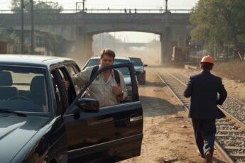 Кортеж подъехал к железной дороге и остановился в тупике перед рельсами. Глава администрации района вышел