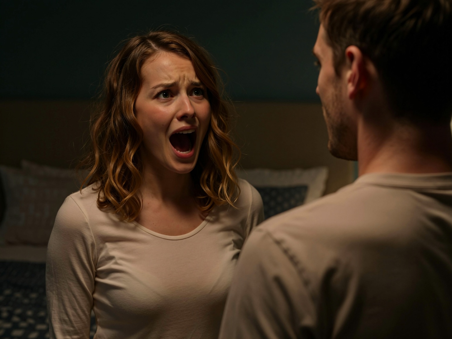 ? Grooming: The female subject’s hair appears naturally styled, with some fly | Enhanced Prompt: A photorealistic medium shot, tightly framed on a young adult female subject, mid-twenties, with fair skin and shoulder-length, wavy light brown hair, positioned slightly left of center in a dimly lit bedroom setting. Her facial features are sharply in focus, capturing an intense expression of shock and distress, mouth open in a shout, contrasting with the male subject who is out of focus and facing away from the camera on the right. The female wears a simple, light-colored long-sleeved cotton top. The scene is characterized by low, dim evening lighting, emphasizing the emotional confrontation. Aesthetic control utilizes a shallow depth of field (f/2.8 aperture simulation) with creamy, smooth bokeh, achieved with a 50mm prime lens, isolating the foreground subject. The image maintains clean digital capture quality with sharp detail and a subtle, warm color tone. SHOT: