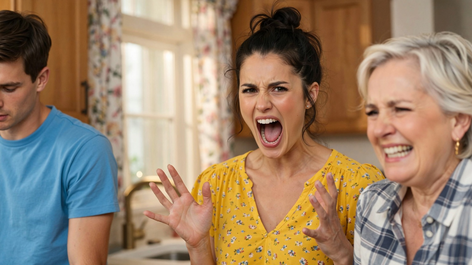 ? Wardrobe: The primary subject is wearing a short-sleeved, V-neck blouse with a vibrant yellow base color and a small, repeating floral pattern in a darker shade, possibly orange or red. The fabric appears to be lightweight, possibly cotton or a blend. | Enhanced Prompt: A realistic medium shot portrait capturing a young adult female in her mid-twenties, exhibiting an intense emotional outburst of distress or anger. Her fair skin contrasts with dark brown hair pulled into a messy bun, and her facial features are contorted with a wide-open shout, narrowed eyes, and furrowed brows. She wears a vibrant yellow, short-sleeved V-neck blouse with a small floral pattern, and her hands are raised in exasperation. The primary subject is positioned slightly off-center to the right, adhering loosely to the rule of thirds, with a young adult male in a blue t-shirt partially visible on the left, and an older female with grey hair in a plaid shirt visible on the right, creating a triangular composition. The scene is a domestic kitchen environment, with the background softly blurred into smooth, creamy bokeh, isolating the subject. The lighting is warm, strong from overhead and possibly a window source, suggesting good illumination. The image is sharp on the subject’s face with a shallow depth of field, clean from optical artifacts, and features a smooth, polished texture. Photorealistic, high-resolution digital capture. SHOT: