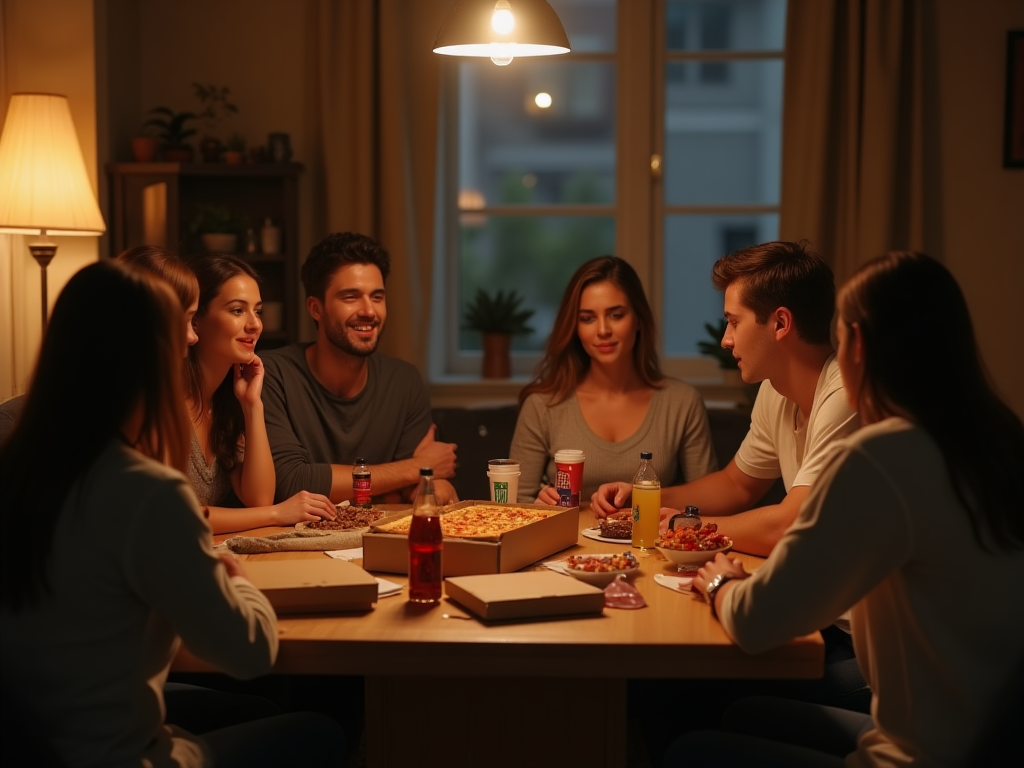 Сбросились, купили продукты, накрыли стол, заказали пиццу. Разговоры за столом велись разные: вспоминали интересные моменты последних лет учебы, делились своими планами.