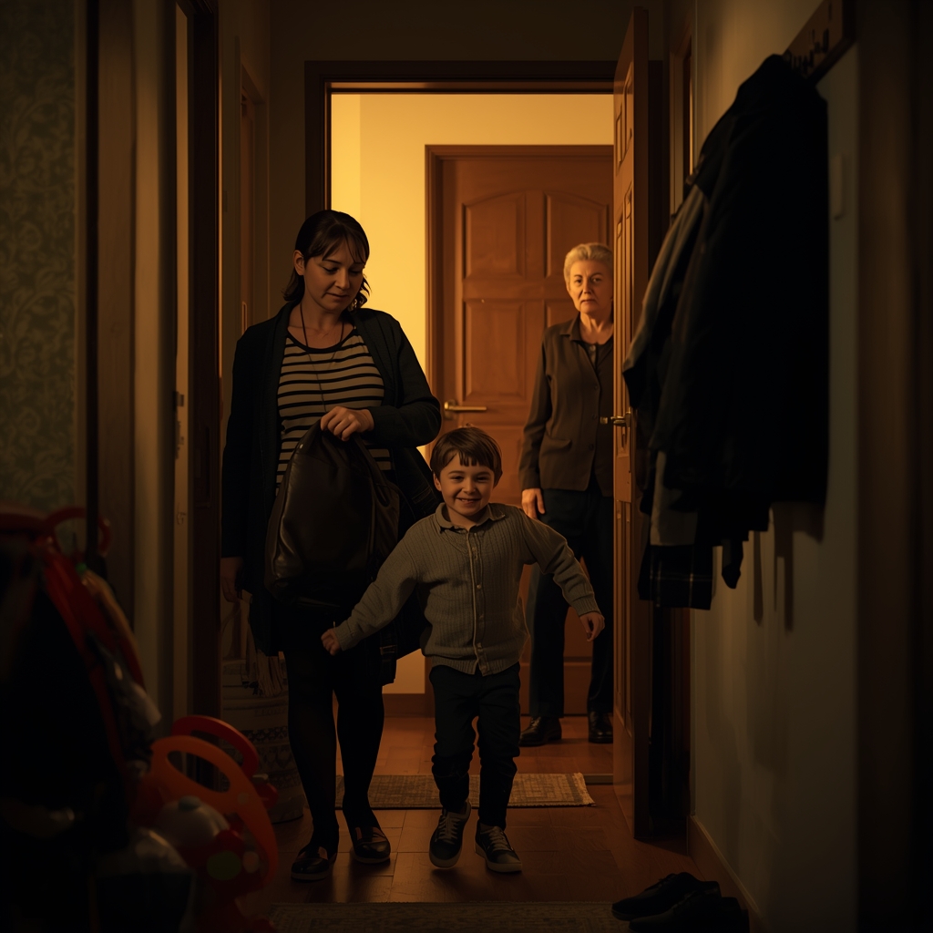 Она молча вышла из своего вре́менного убежища, прошла в спальню, быстро собрала свои вещи и направилась в коридор. Свекровь надела сапоги, пальто, потом повязала шарф. Взяв сумку, она повернулась в сторону кухни. Костя и Карина смотрели на нее через дверной проем.