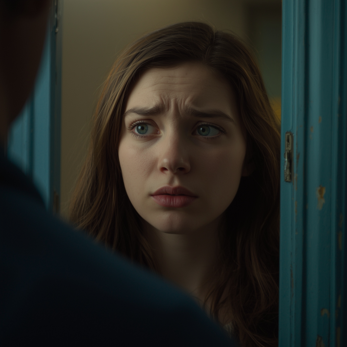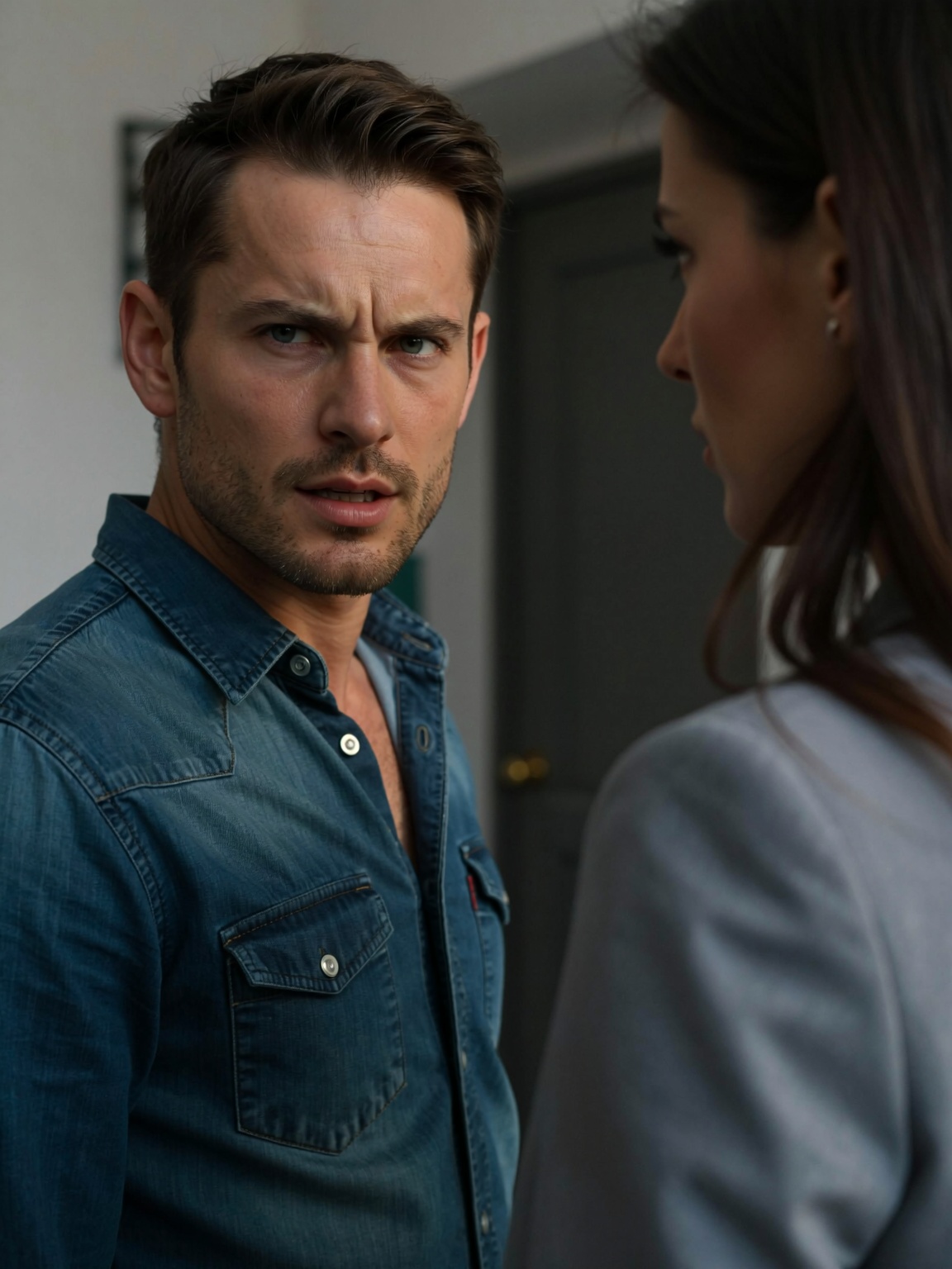 ? Wardrobe: He is wearing a dark teal or deep blue denim shirt, unbuttoned at the collar, | Enhanced Prompt: A photorealistic medium shot of a Caucasian man in his early forties, featuring a strong jawline, a furrowed brow, and deep-set eyes conveying an intense and confrontational expression with a visible frown. He wears a dark teal denim shirt, unbuttoned at the collar. The man is positioned slightly off-center to the left, adhering to the rule of thirds, facing towards the right of the frame. The right side of the frame is dominated by the softly blurred shoulder and back of another person, creating depth. A doorway behind the man acts as a subtle leading line. The scene is controlled with artificial lighting that has a cool color temperature, providing high digital clarity and sharp details on his face. The aesthetic features a shallow depth of field (f/2.8 to f/4), creamy bokeh, and a natural perspective suggested by an 85mm prime lens. Hyperrealistic, high clarity. SHOT: