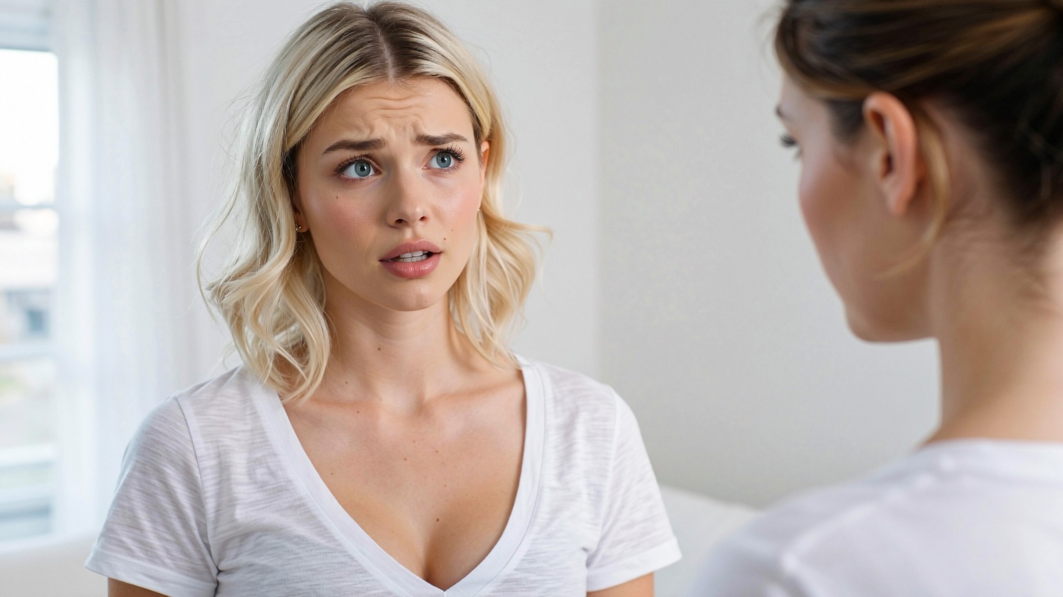 ? Grooming: Her hair appears naturally styled, with | Enhanced Prompt: A photorealistic medium shot, tightly framed on the intensely expressive face of a young adult female in her early twenties, positioned slightly left of center, her light blue eyes wide with concern and her mouth slightly open in a grimace of disbelief. Her wavy, light blonde, shoulder-length hair frames her fair skin, with subtle strands falling near her furrowed brow. She wears a simple, textured white V-neck cotton t-shirt. The scene is an intimate indoor setting, illuminated by clean, high-resolution artificial lighting that minimizes grain. The composition features the soft, out-of-focus right shoulder of another individual in the immediate foreground, creating a sense of immediate proximity and dialogue. The background is a softly blurred environment, utilizing a shallow depth of field (f/2.8 to f/4) achieved with an 85mm prime lens, resulting in creamy, smooth bokeh that isolates the subject’s focused gaze. The aesthetic is clean, sharp, and highly detailed. SHOT: