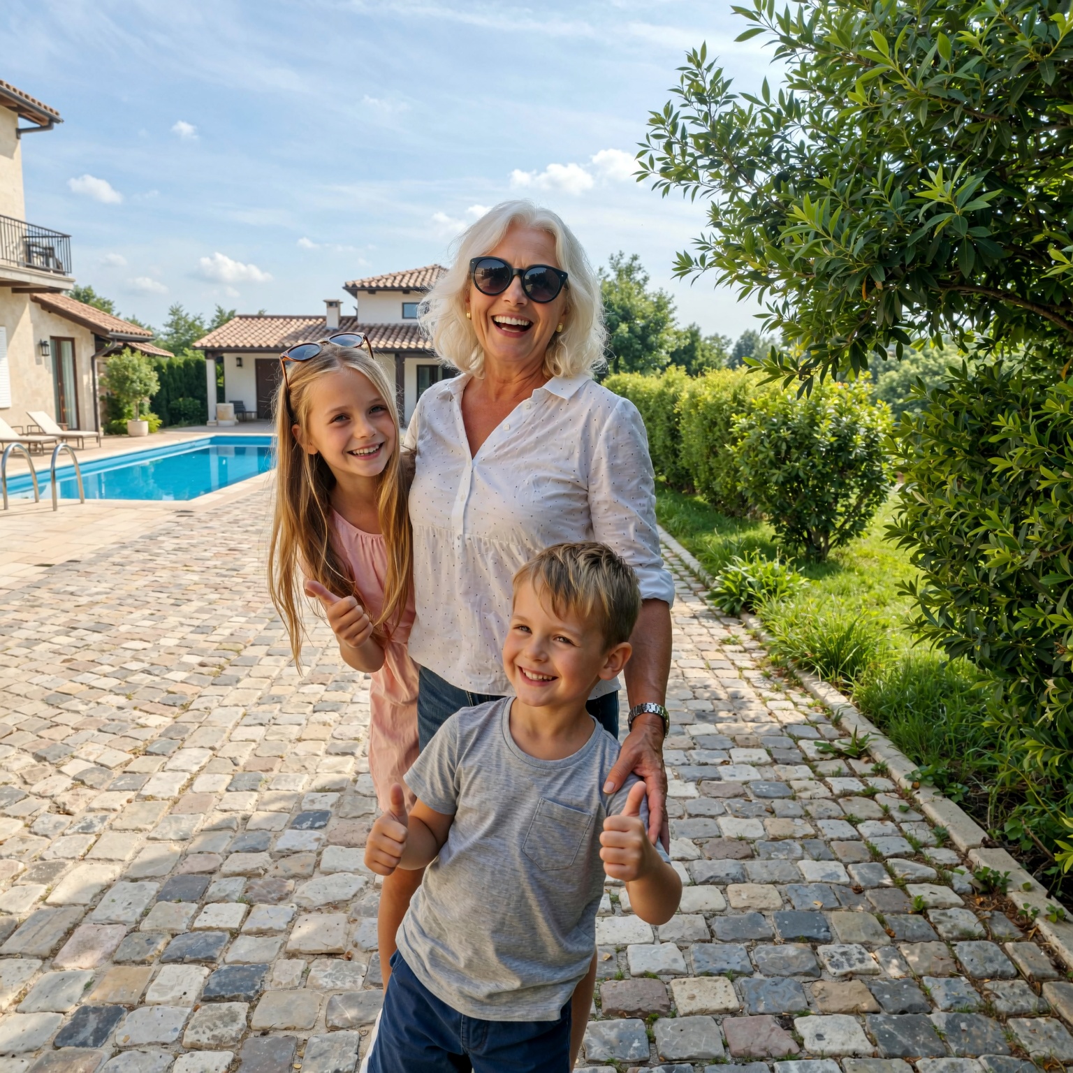 ? Wardrobe: | Enhanced Prompt: A realistic, sun-drenched medium shot, slightly low angle, capturing a joyful grandmother and two young children from the knees up, forming a tight triangular composition slightly weighted to the left. The grandmother, Caucasian, late 60s, with a medium build, styled white hair, and broad smile behind sunglasses, stands slightly right of center. To her left, an 8-10 year old girl with long blonde hair looks directly at the camera with a slight smile, beside a 5-7 year old boy with short light brown hair giving a cheerful thumbs-up gesture towards the left. The foreground is dominated by a leading line of old cobblestone pathway directing the eye toward the subjects. The midground features a bright blue swimming pool and a Mediterranean-style villa, framed by lush green foliage on the right. The scene is under bright, direct daylight, resulting in high clarity, low noise, and sharp focus on the subjects with a moderate depth of field (f/5.6-f/8) ensuring the immediate background remains subtly defined. The aesthetic is sharp, clean, and vibrant, captured with a subtle wide-angle lens effect emphasizing depth. Photorealistic, high clarity. SHOT:
