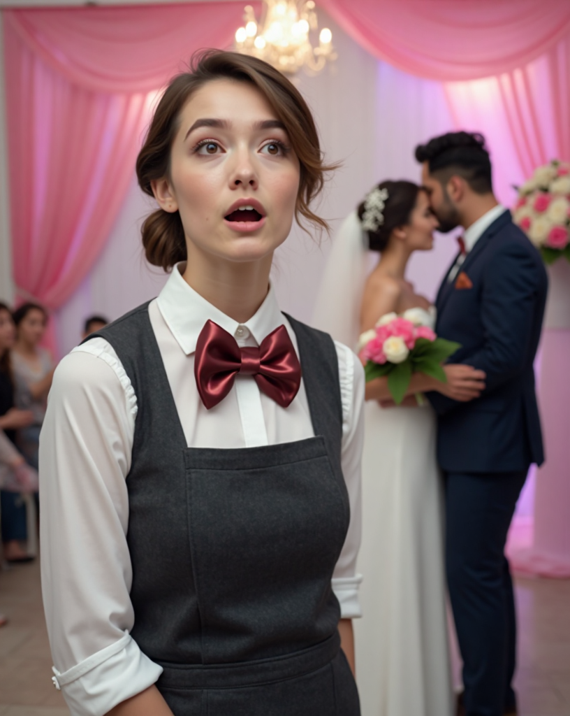 Женщина метнулась по коридору, вынося подносы, бегая обратно. Она так увлеклась, что не заметила, как столкнулась с женихом, который шёл по коридору. Он извинился и хотел уйти, но вдруг услышал: