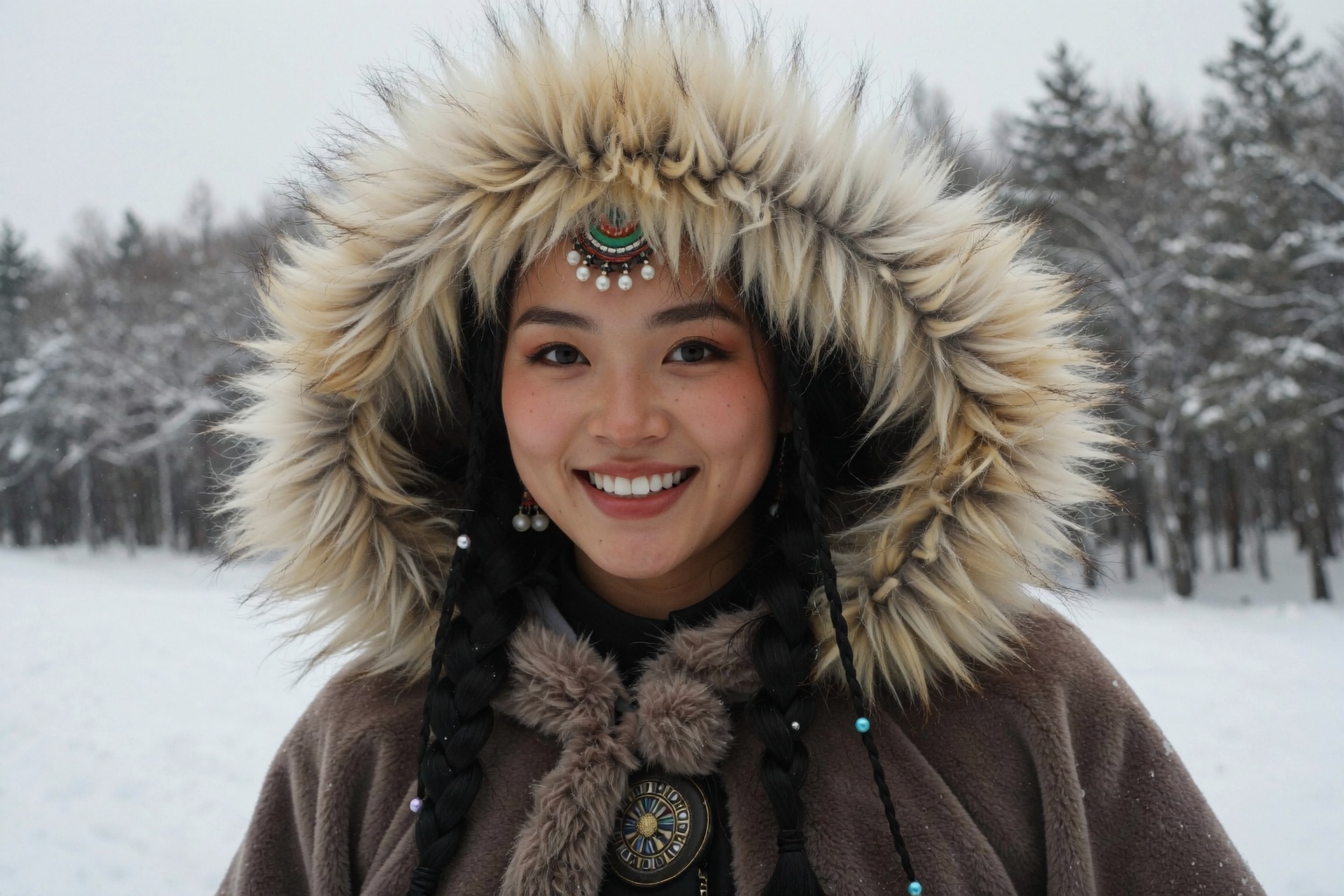? Time of Day: Appears to be daytime, with | Enhanced Prompt: A photorealistic medium shot, centered framing, of a young adult female of East Asian or Indigenous Siberian descent, featuring a round face, dark eyes, and a warm, gentle smile against fair skin. She wears a traditional, heavy fur-lined hooded garment; the voluminous hood is trimmed with thick, shaggy fur, and a circular, embroidered embellishment sits at her chest. Her dark hair is styled in neat braids adorned with small beads, falling from beneath the hood. She is positioned outdoors in a snowy landscape, with a blurred background suggesting a coniferous forest covered in snow. The aesthetic control mandates natural, overcast daylight, resulting in fine, well-controlled black and white film grain, sharp focus on her face, and a creamy, smooth bokeh isolating her from the environment. This composition utilizes a shallow depth of field (f/2.8-f/4) for strong subject separation. SHOT: