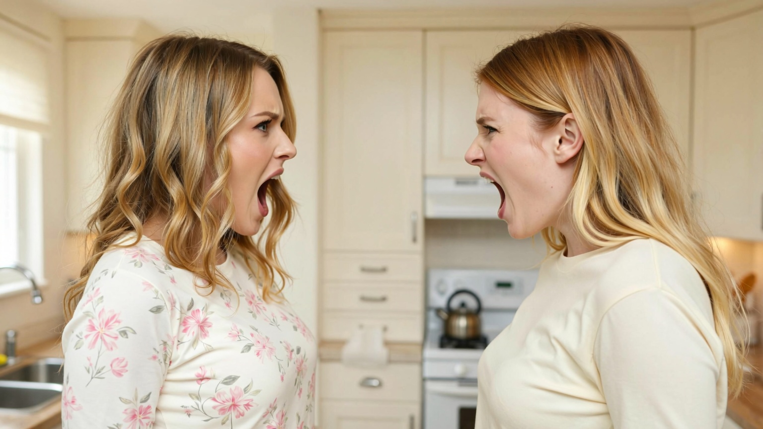 ? Wardrobe: The woman on the left wears a light-colored (likely white or cream) long-sleeved top with a subtle, small-scale pink floral pattern. The woman on the right wears a plain, light-colored (likely white or cream) long-sleeved top. Both garments appear to be made of soft, casual fabric like cotton or a blend. | Enhanced Prompt: A photorealistic medium shot, framed from the chest up, capturing two young adult Caucasian women, both with fair skin and reddish-blonde hair, positioned in sharp profile facing each other, creating intense symmetrical tension. The woman on the left has shoulder-length wavy hair and wears a light cream long-sleeved top with a subtle pink floral pattern; the woman on the right has slightly longer, straighter hair and wears a plain light cream long-sleeved top. Both subjects display intense, confrontational expressions, mouths open as if mid-shout, with furrowed brows and narrowed eyes. The scene is a softly lit indoor kitchen environment, with the background details blurred into creamy, smooth bokeh, isolating the subjects. The aesthetic is controlled, utilizing natural window light augmented by soft interior illumination, resulting in sharp focus on their faces and a smooth, high-detail texture with minimal grain. SHOT: