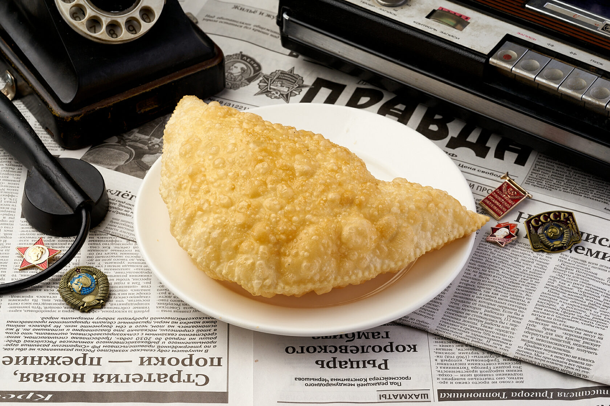 Купила чебурек горяченький, сочный, стоит, ест, сок бежит, ммм, вкуснятина.