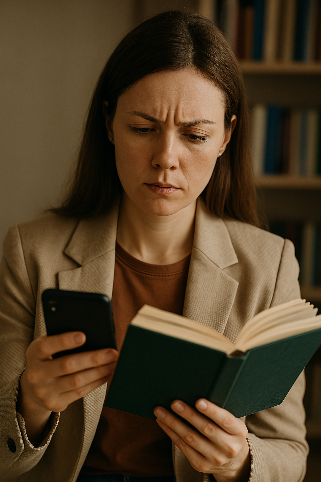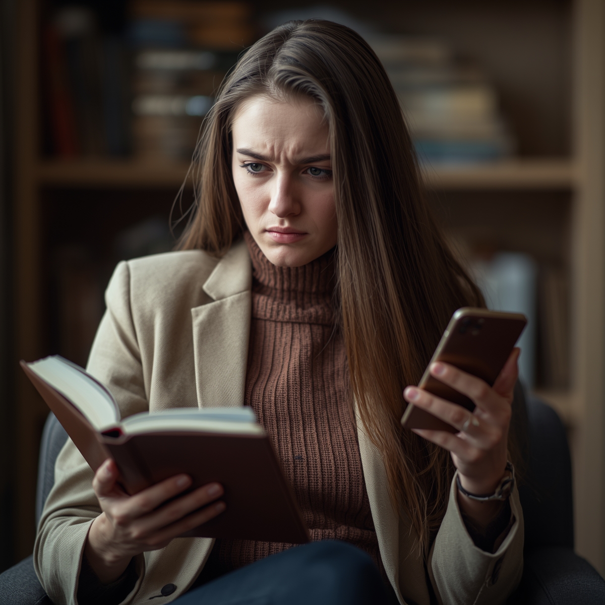 Женщина отложила в сторону книгу, и её брови поднялись вопросительно вверх.