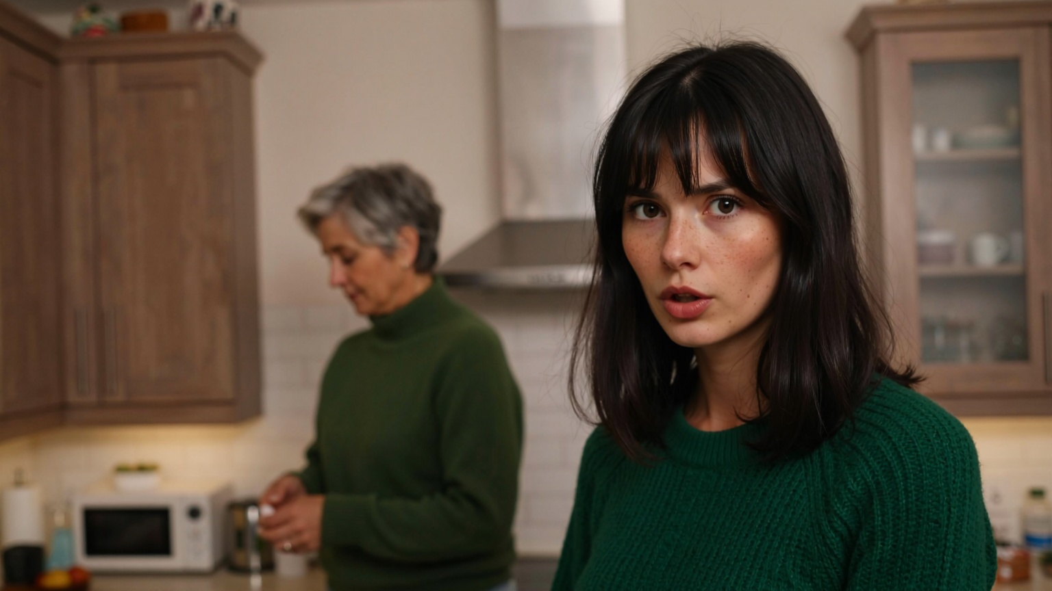 ? Wardrobe: The foreground subject wears a | Enhanced Prompt: A photorealistic medium shot of two women in a warm, well-lit modern kitchen, focusing on the foreground subject: a young adult female, early twenties, fair skin with freckles across her nose and cheeks, sporting medium-length dark brown hair with bangs. Her expression is one of clear displeasure, lips slightly pursed, looking directly at the viewer with dark eyes, wearing a textured, deep emerald green knit sweater. The background subject, an older adult female in her late fifties, with fair skin and short gray hair, stands slightly to the left, looking down neutrally at a task on the counter. The scene features a clean kitchen counter and cabinets providing strong horizontal and vertical lines grounding the composition, loosely following the rule of thirds with the foreground subject off-center right. The lighting is a mix of ambient and artificial indoor light, captured with a moderate depth of field (f/2.8-f/4) suggesting creamy, unobtrusive bokeh that softens the background subject and environment. A subtle, fine digital grain texture enhances the realism. Hyperrealistic, high detail. SHOT: