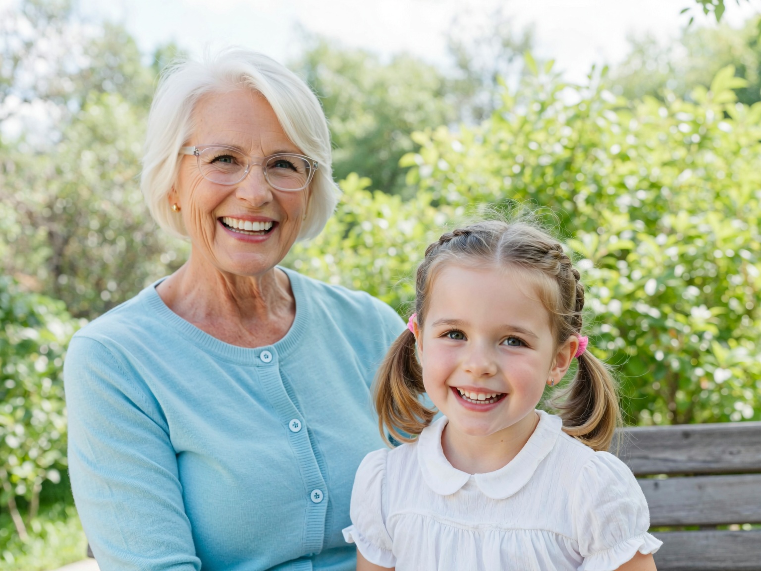 * Grandmother: | Enhanced Prompt: A photorealistic medium shot capturing the upper bodies of a grandmother and her granddaughter, framed slightly off-center with the grandmother on the left and the child on the right, creating a balanced visual weight. The grandmother, appearing in her late 60s with a slender build, fair skin, short silver-white hair, and clear-rimmed glasses, wears a soft, light blue cardigan, her expression warm and joyful with a slight head tilt towards the child. The granddaughter, a petite Caucasian child aged 5-7, has light brown hair in two pigtails secured with pink ties, displaying round, youthful features and a broad, happy smile. They are positioned in the foreground against a background of softly blurred green foliage, rendered with creamy, smooth bokeh from a shallow depth of field (f/2.8). The scene is illuminated by bright, diffused daylight, providing clean, high-resolution clarity with no visible film grain or optical artifacts. SHOT: