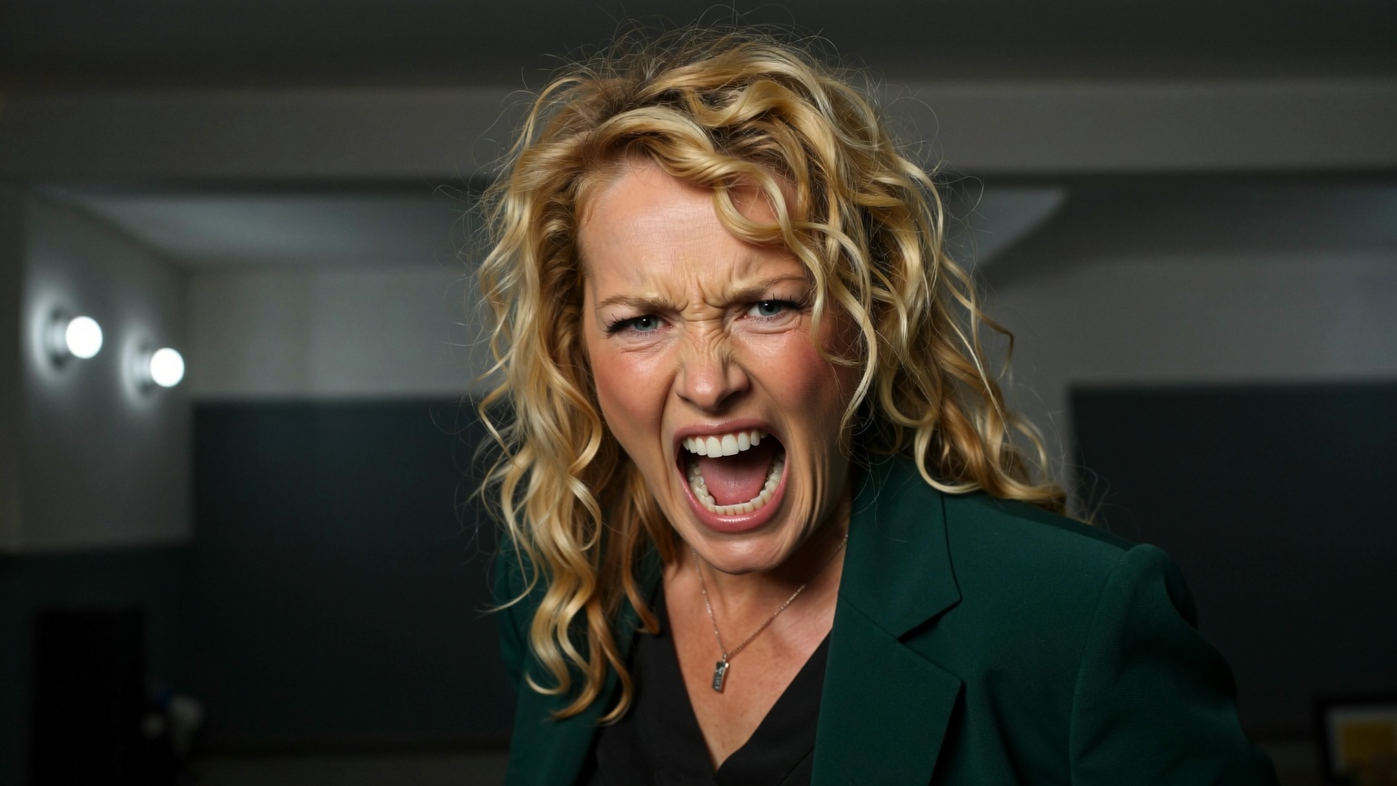 ? Grooming: Her hair is styled in a | Enhanced Prompt: A highly realistic, intense medium close-up portrait of a Caucasian woman in her early sixties, exhibiting an expression of extreme anger and distress, with a pronounced furrowed brow and a wide-open mouth. Her voluminous, tousled blonde hair is swept back, contrasting with her sharp facial features and fair skin showing detailed wrinkles. She is wearing a structured, dark teal emerald green blazer over a dark V-neck top, accessorized with a thin necklace pendant. The scene is indoors, illuminated by focused artificial light sources, creating a dramatic key light that highlights the intensity of her expression. The composition is tight, slightly off-center to the right, with her head turned dynamically toward the left. The aesthetic features a shallow depth of field (f/2.8-f/4) from a 50mm-85mm lens, ensuring sharp focus on her intense eyes, while the background dissolves into a creamy bokeh. The image is finished with a moderate, gritty film grain texture for an intense, raw feel. Photorealistic, hyperrealistic, high contrast lighting. SHOT:
