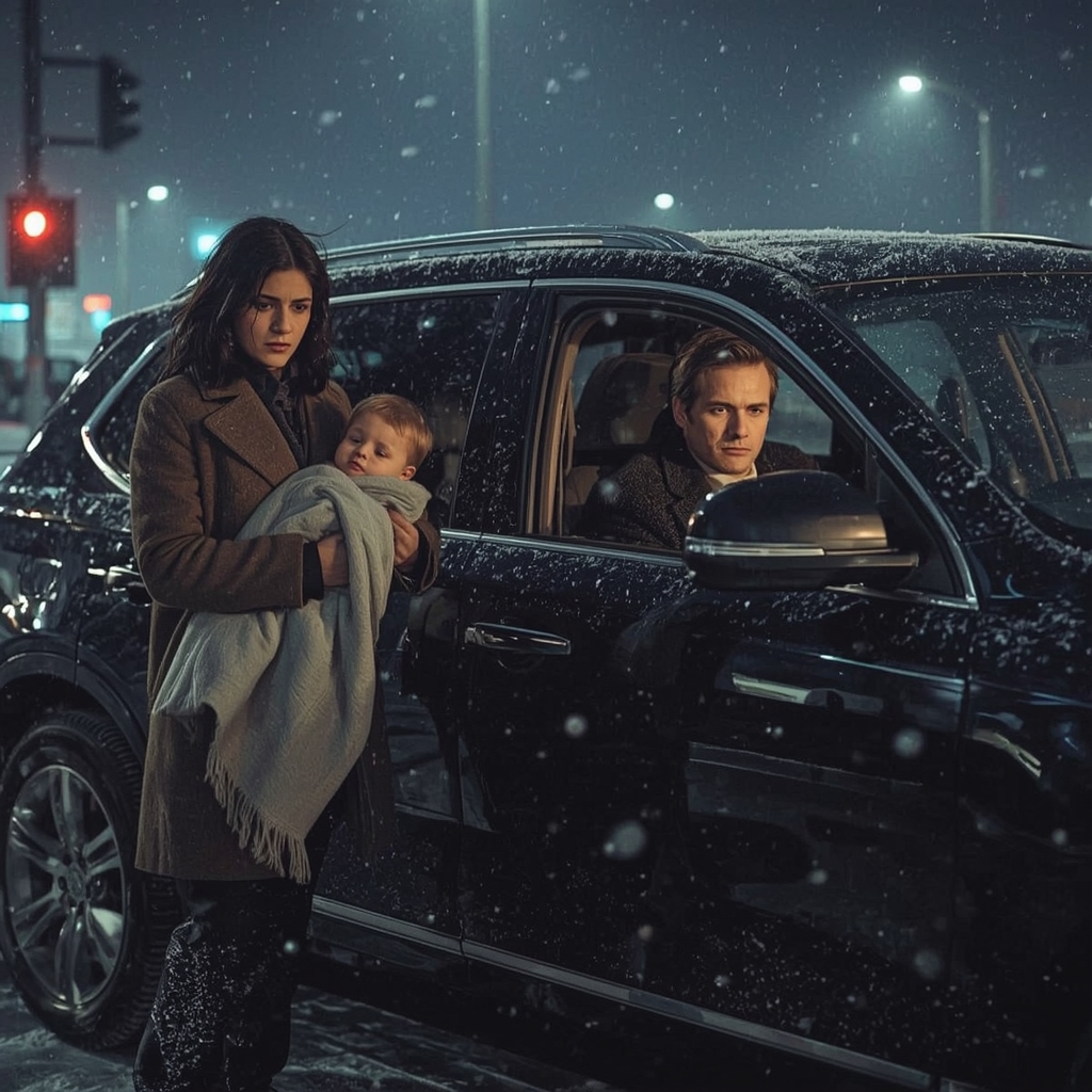 Сквозь метель подъехала тёмная машина. Это был чёрный внедорожник, который блестел даже под снегом. Окно медленно опустилось. Мужчина в тёмном пальто посмотрел на неё. Его голос был спокойным и почти ласковым.
