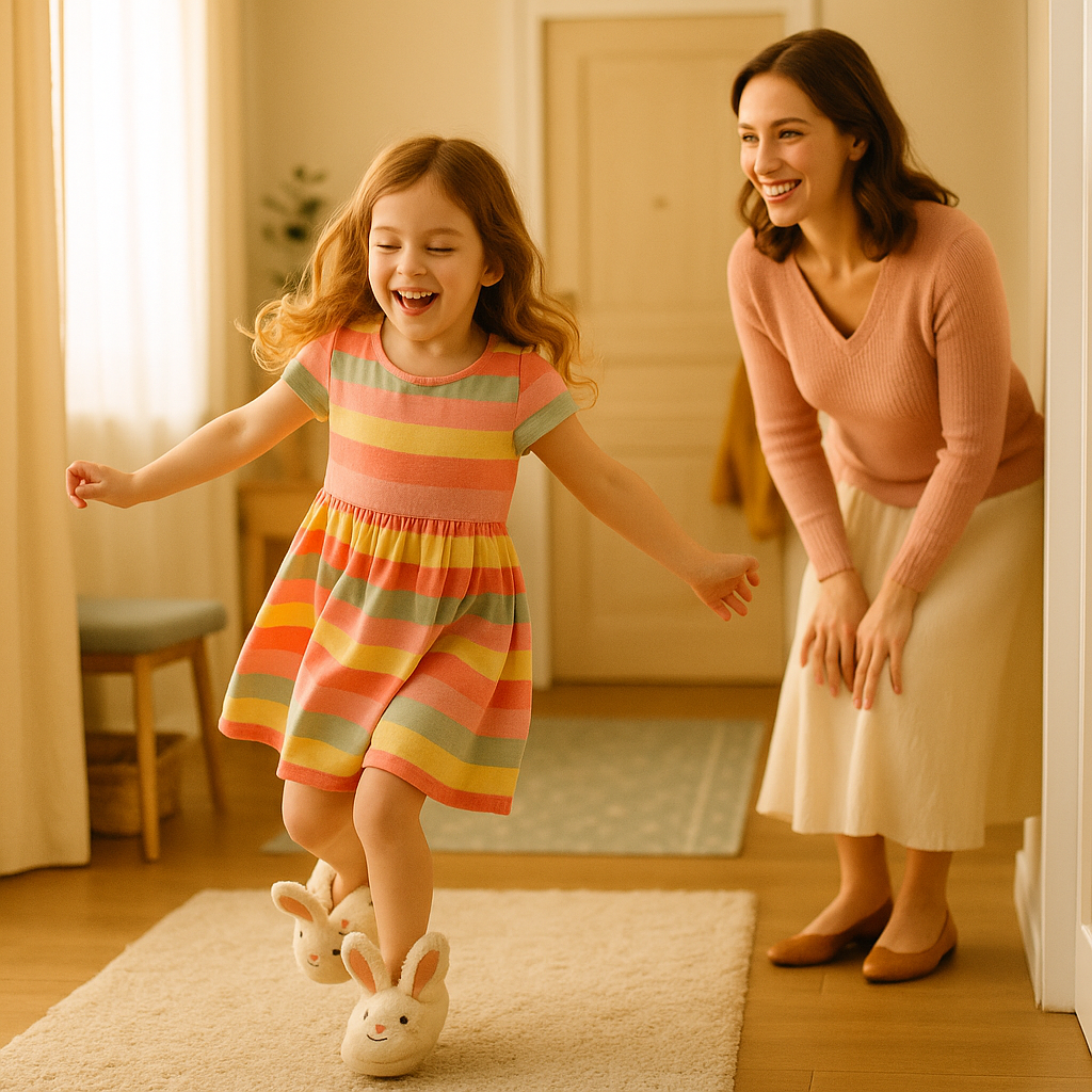 Лиза наклонилась, чтобы снять сапожки и увидела новые, мягкие, симпатичные тапочки-зайцы, которые Нина приготовила ей. Лиза одела их и весело скакала вокруг мамы.