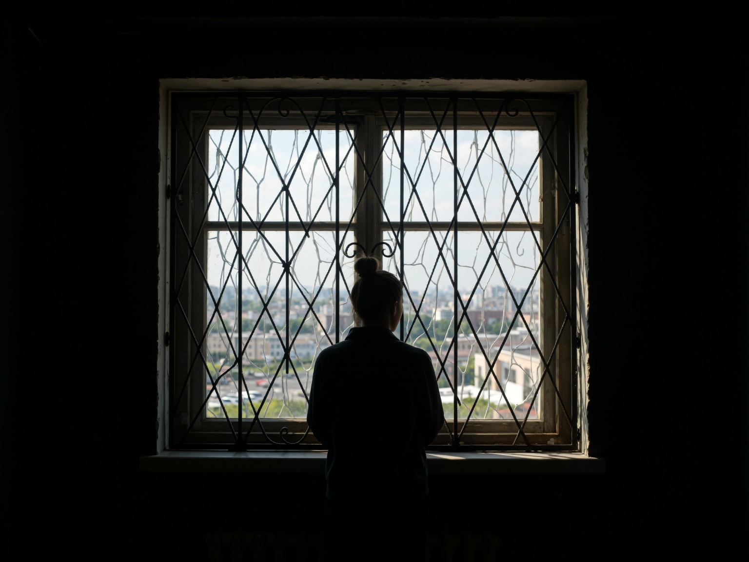 • Composition: Medium shot, framed by a large, dark, rectangular window with a prominent, heavy, dark metal grate. The subject is positioned centrally within the window frame, creating a strong sense of symmetry. The window bars act as strong vertical and horizontal leading lines, dividing the frame and drawing the eye towards the subject and the cityscape beyond. The subject’s silhouette is the primary focal point.