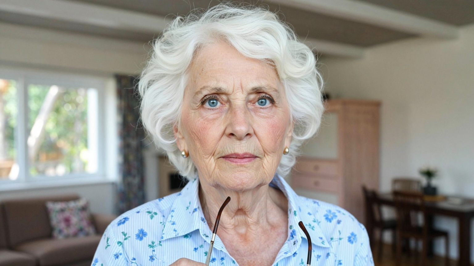 ? Wardrobe: She is wearing a light blue and white collared shirt with a subtle floral or paisley pattern. The fabric appears to be cotton or a cotton | Enhanced Prompt: A hyperrealistic medium close-up shot of an elderly Caucasian woman in her late seventies, featuring voluminous white hair styled in a slightly disheveled short cut, fair skin marked by visible wrinkles, and prominent cheekbones. Her intense, scrutinizing gaze is directed straight at the viewer through wide-open light blue eyes. She is wearing a light blue and white collared cotton shirt with a subtle floral pattern, and her hands are delicately holding her glasses in the lower portion of the frame. The scene is an interior space, with the background featuring softly blurred furniture and a window structure providing subtle structural lines. The aesthetic is controlled by a shallow depth of field (f/2.8 to f/4), isolating the subject with creamy, smooth bokeh. Lighting is a mix of soft natural window light and ambient indoor illumination, creating a clean image with very subtle, fine digital grain. Photorealistic, portrait, high detail. SHOT: