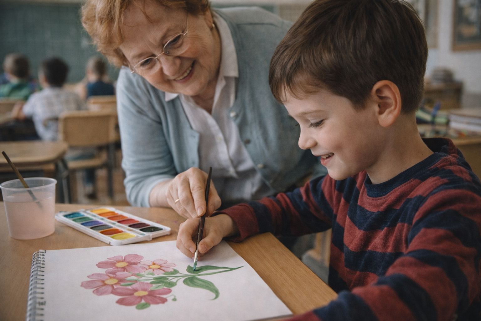 — А ты на кисточку, милый, поменьше нажимай… Вот так — веди ею, как пёрышком по ладошке. Вот! Молодец! Не завиток, а загляденье! — улыбнулась пожилая учительница, — Для кого это ты красоту такую нарисовал?