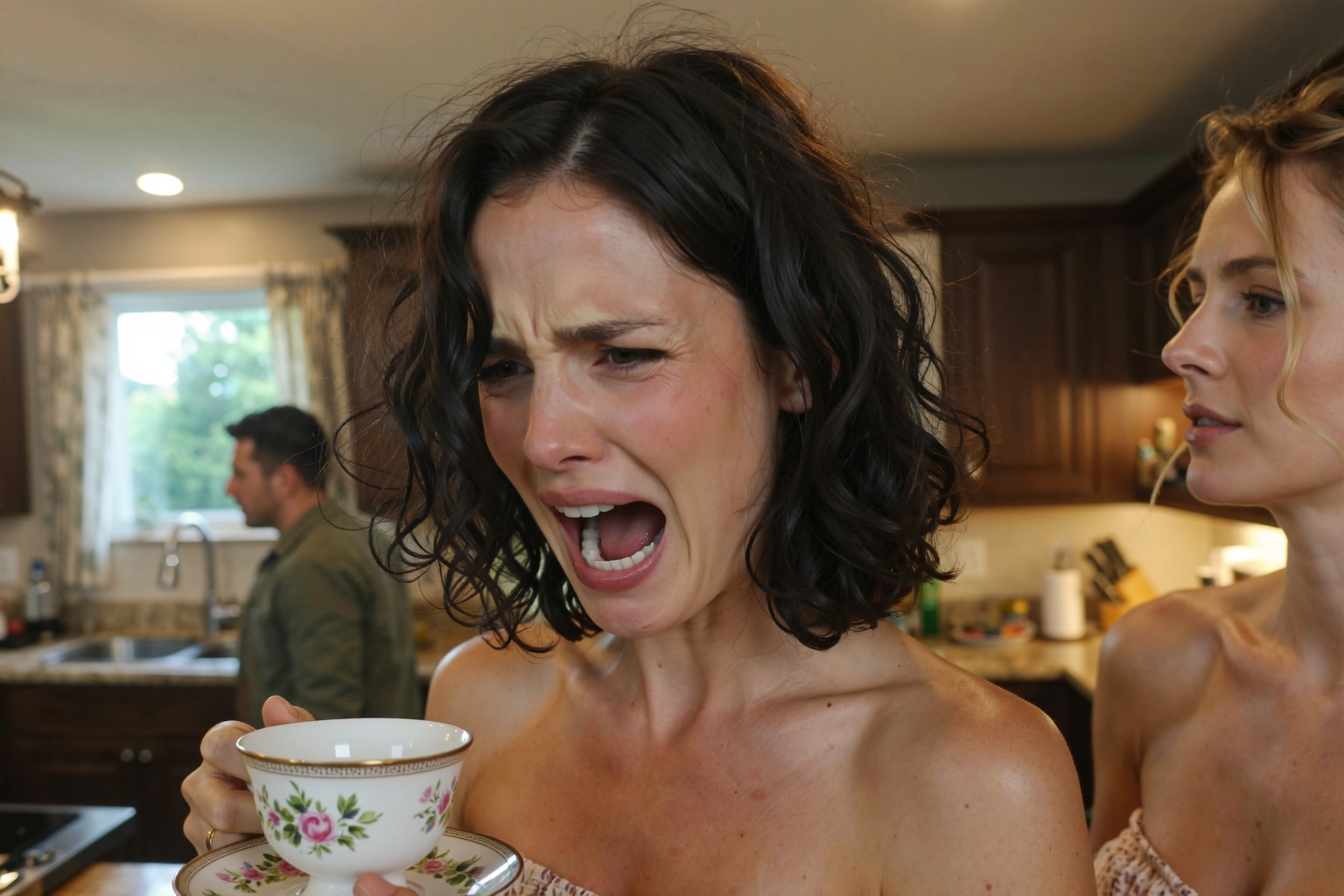 * Foreground Woman (Right): Appears to be a | Enhanced Prompt: A realistic medium shot capturing a tense indoor scene with a shallow depth of field, adhering strictly to the rule of thirds. The primary subject, a Caucasian woman in her late twenties, is positioned slightly off-center to the right, displaying an expression of distress with furrowed brows and an open mouth, holding a delicate teacup. She has fair skin and textured, messy dark brown shoulder-length hair partially obscuring her face. To her right, a second woman is partially visible in the midground. In the background to the left, a man is framed by a window, subtly emphasized by leading lines from the kitchen cabinetry. The lighting is a complex mix of soft natural light from the window and warm interior ambient light, creating moderate contrast. The image exhibits a clean, sharp texture with excellent detail rendition, suggesting a moderate focal length lens (50mm-85mm equivalent) and an aperture around f/4, ensuring sharp focus on the foreground subjects with a gradual, pleasing bokeh in the background. Photorealistic, high detail. SHOT: