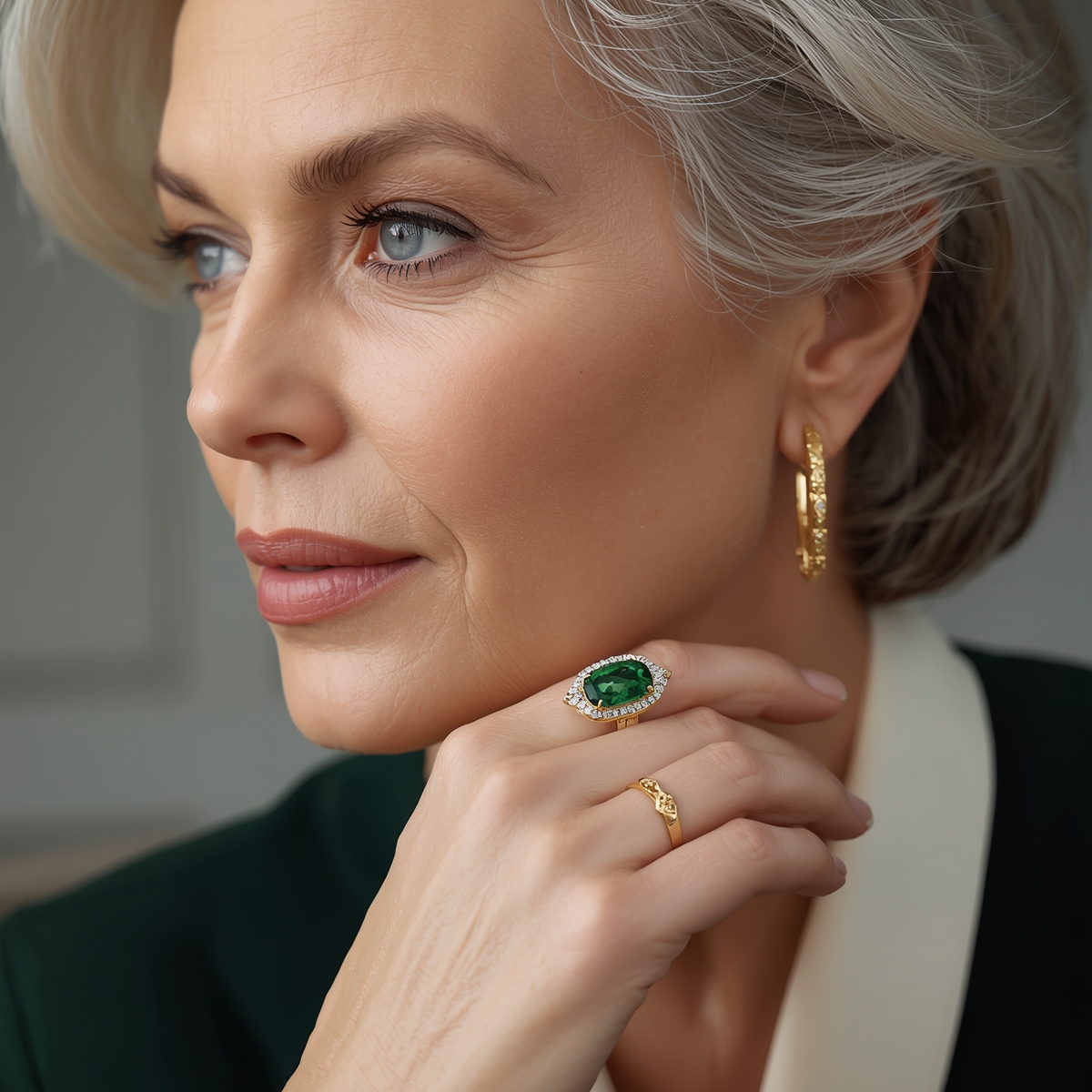 – Посмотрите на это кольцо. До Нового года на него скидка пятьдесят процентов. Натуральный изумруд, вам будет идеально, — с улыбкой сказала консультант, – консультант магазина расплылась в очаровательной улыбке.