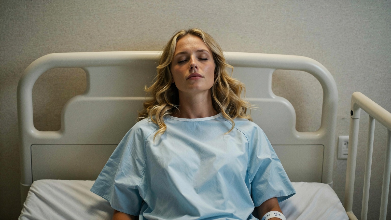 ? Location: Indoor, clearly a hospital room. The background features a plain, light | Enhanced Prompt: A realistic medium shot, centered framing of a Caucasian female subject in her early thirties, slender build with fair skin, her shoulder-length wavy blonde hair appearing slightly disheveled around her serene, sleeping face with closed eyes. She is wearing a loose, light pale blue hospital gown, with a white hospital wristband visible on her left wrist. The scene is an interior hospital room; the subject rests against a white hospital bed, the rail acting as a subtle leading line directing focus towards her. The background is a plain, light-colored wall, softly blurred with creamy bokeh due to a shallow depth of field (f/2.8 to f/4). The lighting is interior ambient light, emphasizing stillness. The overall aesthetic is characterized by moderate to heavy, uniform film grain, suggesting a textured, gritty quality captured with a 50mm-85mm prime lens. Photorealistic, high contrast lighting, deeply textured. SHOT: