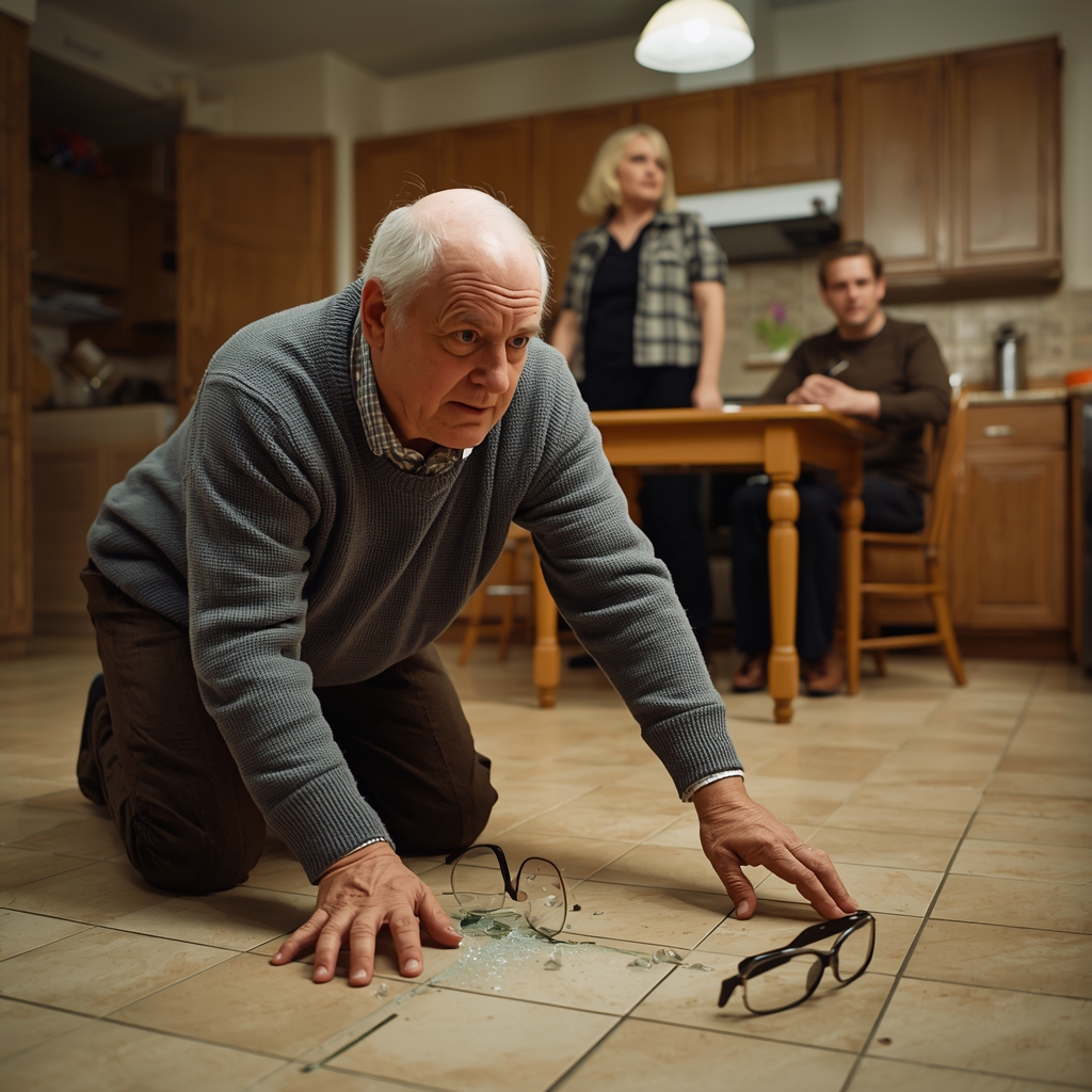 Виктор Петрович медленно, опираясь дрожащими руками о стул, поднялся на ноги. Колени тряслись, перед глазами всё плыло без очков, но он пересилил себя и начал собирать осколки. Пальцы плохо слушались, острые края стекла резали кожу, но он не чувствовал боли.