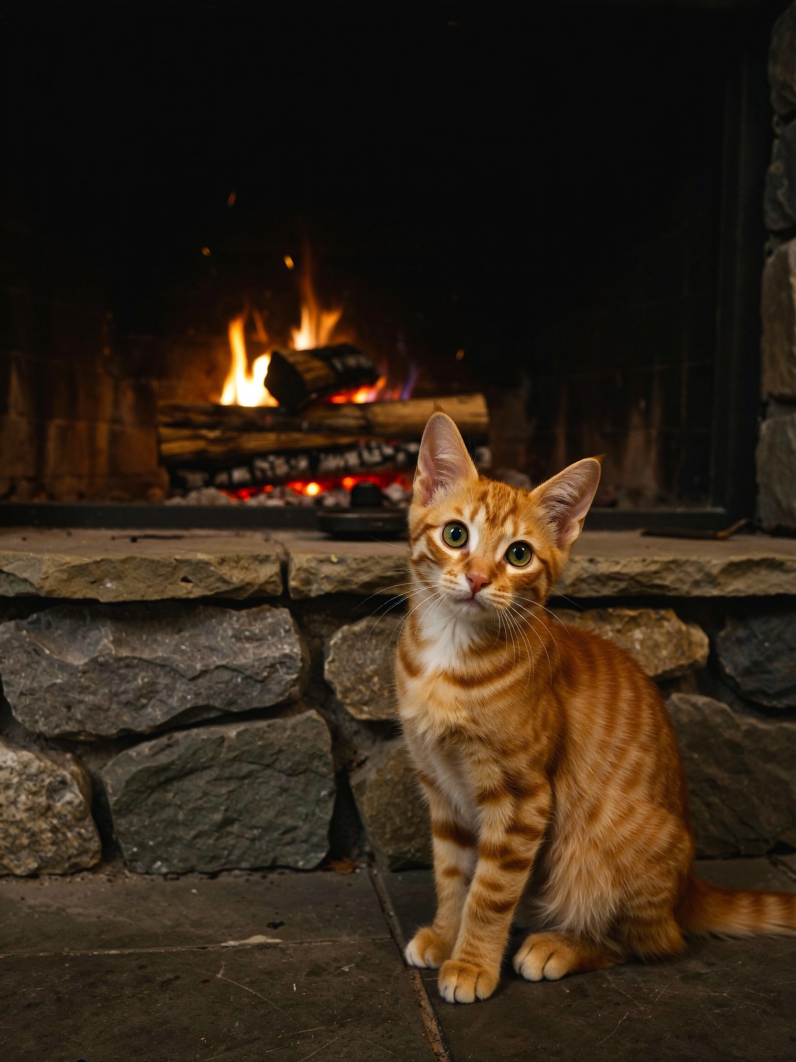 ? Time of Day: Evening or night, indicated by the active fireplace and the dim ambient | Enhanced Prompt: A photorealistic medium shot of an orange tabby kitten, estimated at 3-4 months old, with light orange fur and distinct darker tabby stripes, possessing large, wide-open, curious light green eyes and a small pink nose. The kitten is positioned slightly off-center to the right, its body creating a diagonal line leading from the bottom left foreground. The scene is an intimate indoor setting during the evening, dominated by a large stone fireplace in the background, its rough-hewn grey stones providing texture. The primary light source is the warm, dim glow emanating solely from the active fire, creating dramatic, soft rim lighting and deep shadows. The focus is tack-sharp on the kitten’s face, utilizing a shallow depth of field (f/2.8-f/4) to render the fireplace and hearth into creamy, smooth bokeh. The composition adheres to the rule of thirds, emphasizing the kitten’s alert posture. Hyperrealistic, high detail, low-light photography. SHOT: