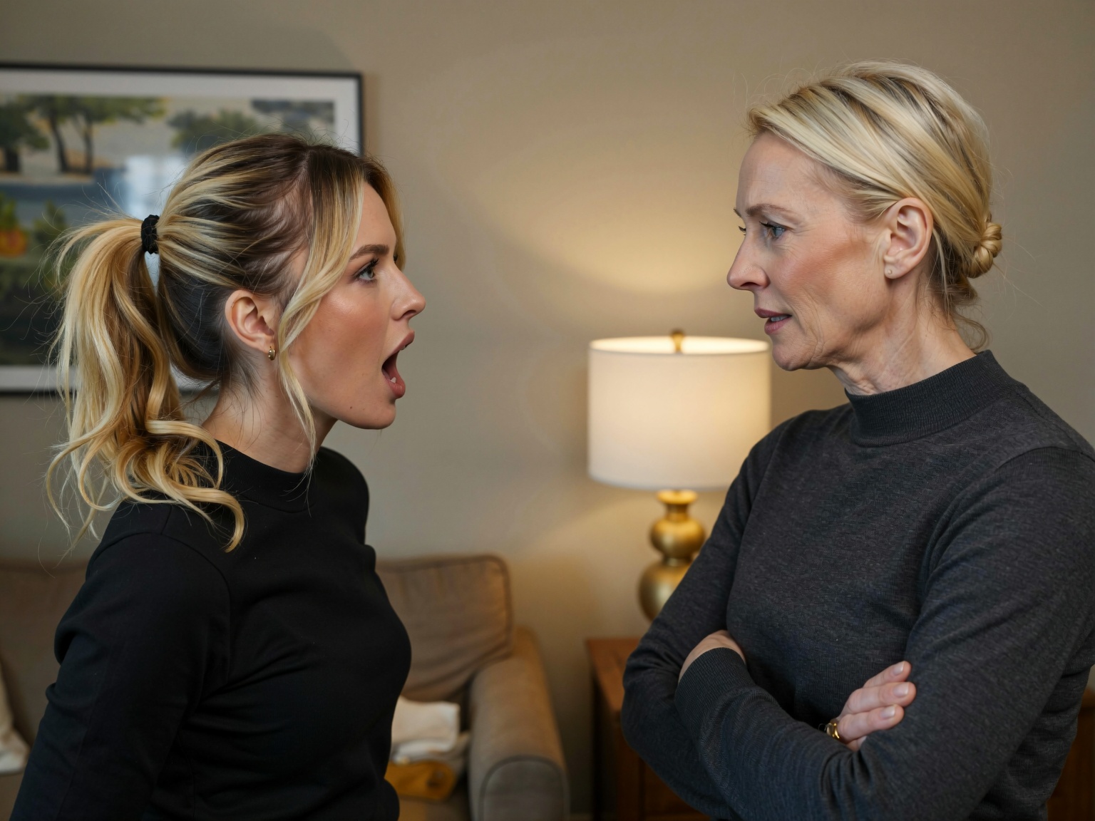 * Older Woman: Appears to be a Caucasian female in her late 60s to early 70s. She has a slender build and appears of average height. Her skin tone is fair with visible age lines. Her | Enhanced Prompt: A realistic medium shot portrait capturing two Caucasian women in a domestic interior, establishing a tense confrontation. The younger woman, early twenties, with a medium build and fair skin, has blonde hair pulled back in a high, wavy ponytail, positioned on the left and angled toward the older woman with her mouth open as if speaking intensely. The older woman, late sixties, slender with fair skin and visible age lines, stands on the right, facing the younger woman with her arms firmly crossed. The scene is illuminated by a mix of ambient room light and a soft key light, suggesting moderate lighting conditions (ISO 400-800). The composition is balanced, centering the figures in the middle third, framed by a sofa and a lamp in the background. A standard 85mm lens effect provides a moderate depth of field (f/5.6), keeping faces sharp with smooth, creamy bokeh in the background. The image exhibits subtle, fine digital grain and clean optics. SHOT: