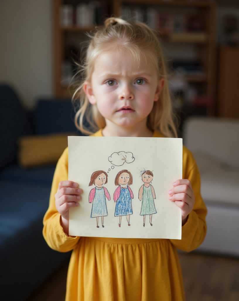 «Милая, почему ты не нарисовала папу в детском саду? Может, он чем-то тебя огорчил?» – спросила я, стараясь говорить мягко. Лили подняла взгляд, её большие глаза полны сомнения.
