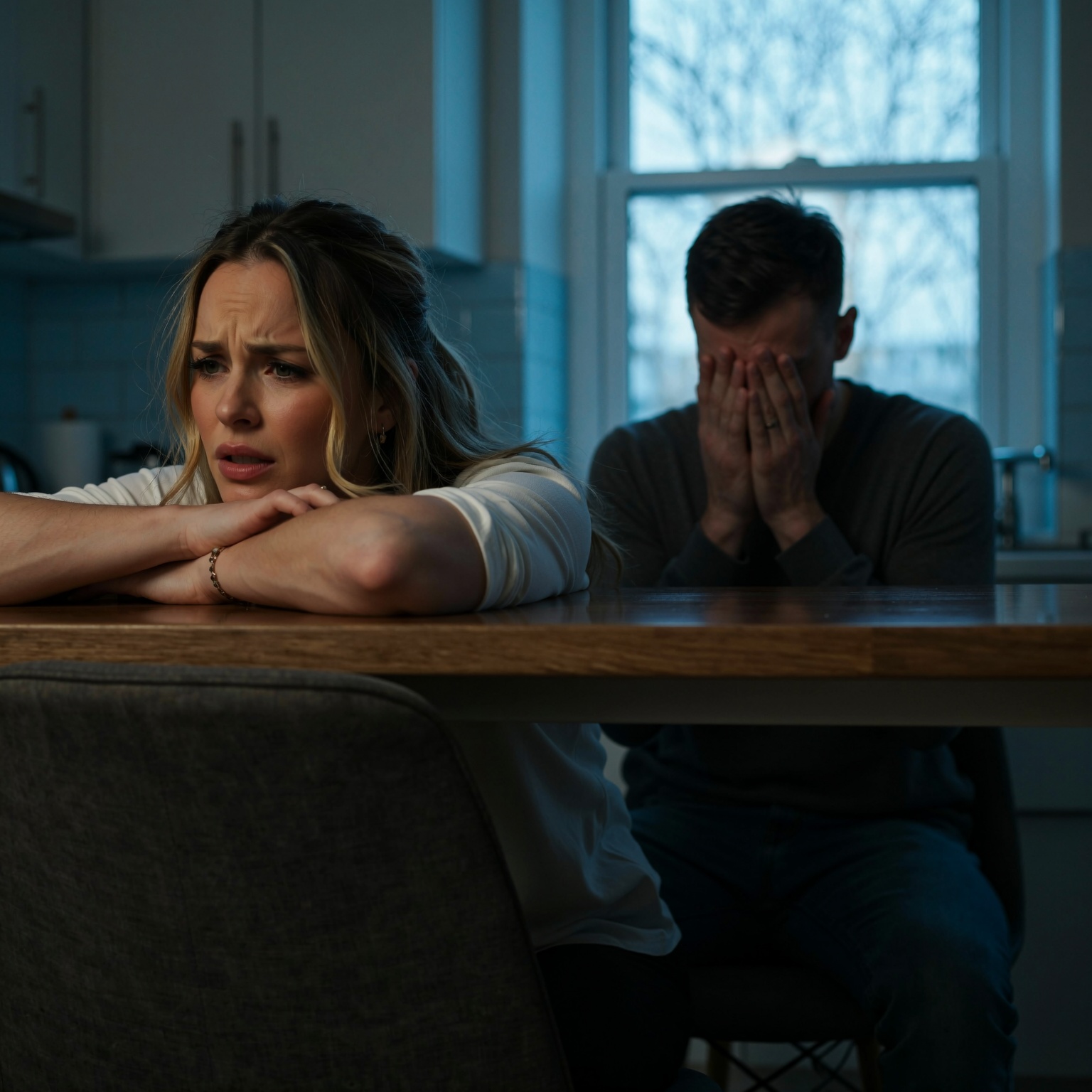? Description: The woman appears to be in her late 30s to early 40s, with a fair to medium skin tone. She has shoulder-length, light brown hair with subtle highlights, styled loosely. Her facial features are prominent, with a furrowed brow and a tense, worried expression. Her eyes are directed downwards and to her left. The man appears to be in his late 20s to early 30s, with a fair skin tone and short, dark brown hair. His build appears average. He is hunched over with his head in his hands, obscuring most of his facial features | Enhanced Prompt: A realistic medium shot, slightly off-center, capturing a moment of emotional tension between a woman and a man seated at a table. In the left foreground, the woman, late 30s with fair skin and loosely styled light brown hair, leans forward with a furrowed brow and a tense, worried expression, her arms resting on the back of her chair, eyes directed downwards. In the right background, the man, late 20s with short dark hair, is hunched over, his head buried in his hands, completely obscuring his face, emphasizing their emotional distance. The scene is a dimly lit interior kitchen, with a strong, cool light source from a window framing vertical lines in the background. The composition is intentionally unbalanced, using the horizontal table as a dividing element. The aesthetic is characterized by a moderate depth of field (f/2.8-f/4), sharp focus on the woman, and a clean, smooth texture with minimal grain, suggesting a high-quality digital capture. Photorealistic, dramatic lighting. SHOT: