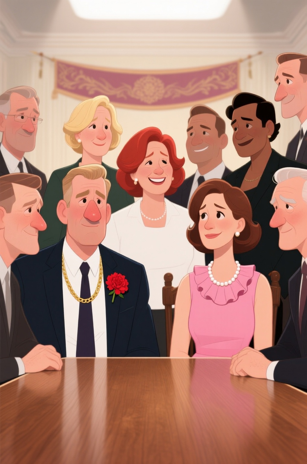 * Woman next to him: Pink sleeveless dress with a ruffled neckline, pearl necklace | Enhanced Prompt: A medium shot capturing a diverse group of approximately ten caricatured adults seated and standing around a long table. The composition is horizontally oriented, subjects overlapping to create a dynamic, somewhat claustrophobic feel, with the table forming a strong horizontal anchor. The illustration style features exaggerated features: prominent noses, chins, and distinct hairstyles, with varied skin tones and hair colors (blonde, red, brown, black). Facial expressions range from cheerful to weary. Attire suggests a formal event: the man on the far left wears a white shirt, dark tie, dark suit jacket, a red carnation boutonniere, and a gold chain necklace; the woman next to him wears a pink sleeveless dress with a ruffled neckline and a pearl necklace. A decorative banner is visible in the slightly softened background. The image exhibits smooth, digital clarity with a clean and sharp texture, indicating a high-resolution digital capture. Lighting is controlled, artificial studio lighting, suggesting a low ISO. The depth of field is moderate (f/4 to f/5.6 equivalent), keeping most faces and the central elements in sharp focus with minimal optical distortion. Color palette dominated by skin tones, dark suit colors, pink, white, and the warm tones of the wooden table. Professional digital illustration, sharp focus, high detail, clean aesthetic, Ultra HD, 4K. SHOT: