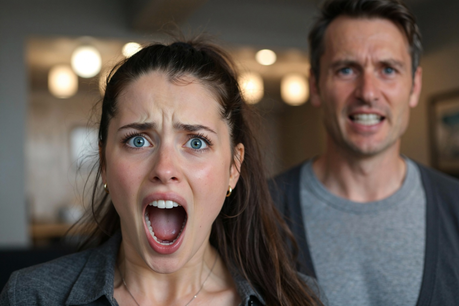 * Man: Appears to be middle-aged, likely in his late 40s to | Enhanced Prompt: A photorealistic medium shot, tightly framed on two individuals indoors under moderate artificial lighting with ambient fill. The subject is a young Caucasian woman in her early twenties, positioned slightly left of center, her face dominating the foreground with wide, expressive blue eyes, furrowed eyebrows, and an open mouth captured mid-gasp or shout, featuring fair skin with subtle redness and long, dark brown hair pulled back in a ponytail. To her right and slightly behind stands a middle-aged man in his late forties, his face also visible but softer in focus. The composition utilizes a shallow depth of field, estimated at f/2.8, with the woman’s face in sharp focus, rendered by an 85mm prime lens, creating creamy, indistinct bokeh in the blurred background. The image exhibits high clarity, low noise, and minimal vignetting, emphasizing the intense emotional exchange between the subjects. SHOT: