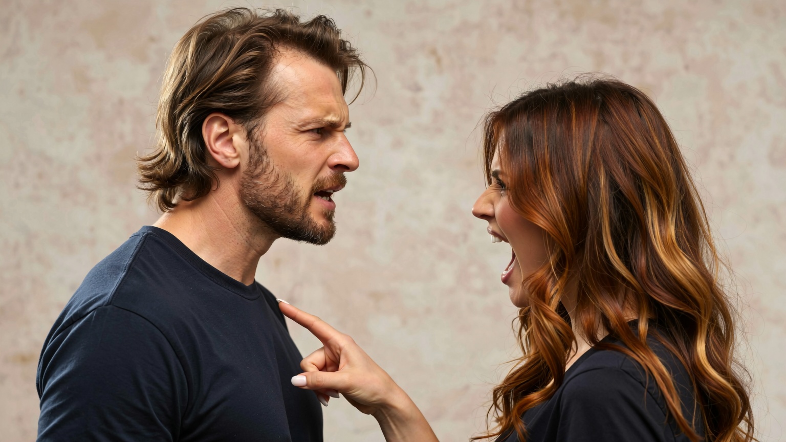 • Composition: Medium shot, framing the upper torsos and heads of two individuals in a confrontational pose. The subjects are positioned slightly off-center, with the woman on the right and the man on the left, creating a dynamic tension. The woman’s pointing finger acts as a strong leading line directed towards the man’s chest. The composition is balanced by the opposing gazes and body language.