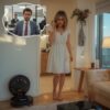 Та шла в стильном костюме под руку с высоким молодым красавцем.