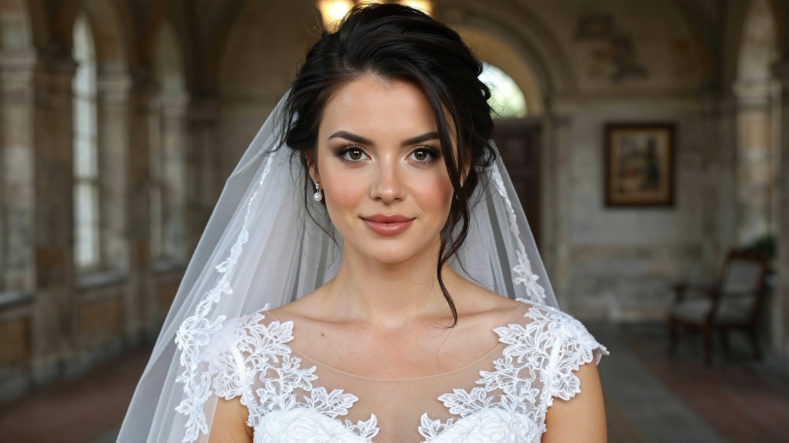 ? Location: An indoor setting, likely a historic building | Enhanced Prompt: A photorealistic, medium close-up portrait of a serene young adult female, appearing to be in her early twenties, centered in the frame with a slight, elegant tilt of her head to her left. She has a fair skin tone with a subtle rosy blush, large expressive dark eyes, and full lips, conveying a direct yet gentle smile. Her dark brown hair is meticulously styled in an elegant updo, partially obscured by a sheer white bridal veil extending over her right shoulder. She wears a white bridal gown featuring intricate lace detailing on the shoulders and neckline. The scene is an indoor setting, likely a historic building, with the background softly blurred by a creamy, smooth bokeh, suggesting a shallow depth of field (f/2.8). The lighting is a mix of soft natural window light and subtle fill light, creating a clean image texture with very fine digital grain. This balanced composition is captured with a sharp 85mm prime lens, emphasizing her refined grooming. SHOT: