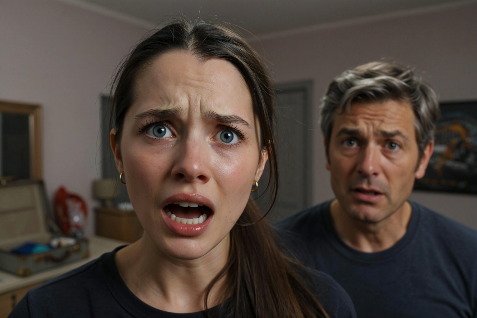 * Man: Appears to be a middle-aged adult, likely in his late 40s to early 50s. Caucasian ethnicity. Medium build. His facial features include tired-looking eyes, a furrowed brow, and a slightly open mouth. His | Enhanced Prompt: A photorealistic medium close-up shot tightly framing the faces of a young adult woman and a middle-aged man, positioned asymmetrically with the woman slightly left of center dominating the foreground. The woman, in her early twenties with a pale complexion, features wide, intensely expressive blue eyes, furrowed brows, and an open mouth showing teeth, conveying intense fear or shock; her dark brown hair is pulled back in a ponytail. The man, late forties, stands slightly behind her to the right, his tired eyes and furrowed brow suggesting concern. The scene is an interior space, with a blurred suitcase and furniture visible in the background, isolated by a shallow depth of field (f/2.8). The lighting is controlled ambient room light with a soft key light, resulting in smooth textures and preserved fine skin detail. The composition utilizes a natural perspective lens effect, emphasizing the woman’s emotional state against the man’s worried presence. Hyperrealistic, high detail, smooth bokeh. SHOT: