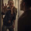 ? Wardrobe: She is wearing a high-necked, long-sleeved turtleneck sweater in a bright, solid cyan blue color (#00 SHOT: