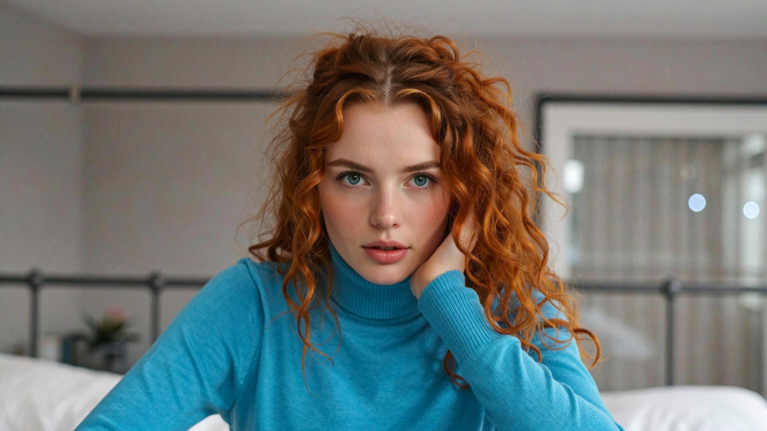 • Description: A young adult female, appearing to be in her late teens to early twenties. She has fair skin with a neutral undertone. Her hair is a vibrant, coppery red, styled in loose, voluminous curls and updos, with wisps framing her face. Her facial features are delicate and symmetrical, with high cheekbones and a defined jawline. Her eyes are a striking bright blue, wide open and looking directly at the camera. Her expression is neutral to slightly serious, with a hint of melancholy.