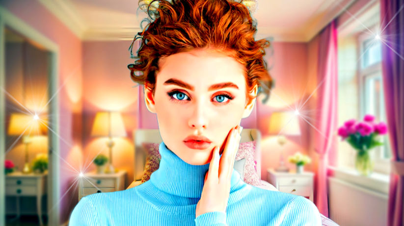 ? Wardrobe: She is wearing a high-necked, long-sleeved turtleneck sweater in a bright, solid cyan blue color (#00 | Enhanced Prompt: SHOT: