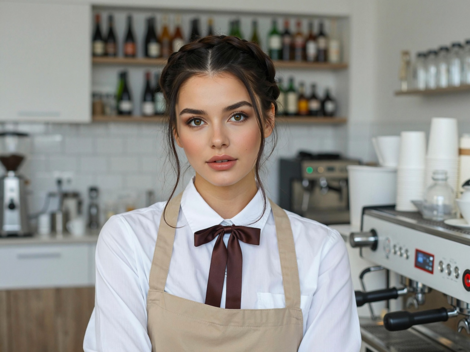 ? Wardrobe: She is wearing a crisp white collared button-down shirt made of a fine cotton or poplin material. Over the shirt, she wears a tan or light brown apron, with straps going over her shoulders and crossing at the back (implied). Around her neck, she has a dark brown, almost black, satin ribbon tied into a neat bow at the collar of | Enhanced Prompt: A photorealistic medium shot portrait of a young adult female, aged 18-22, with fair skin and warm undertones, featuring delicate features, high cheekbones, and striking hazel eyes looking directly at the viewer with a neutral, professional expression. Her dark brown hair is styled in a neat braided updo with soft wisps framing her face. She is wearing a crisp white collared button-down shirt made of fine cotton, overlaid with a tan apron, and a dark brown satin ribbon tied into a neat bow at her collar. The scene is a clean, modern cafe environment, with shelves of bottles and a coffee machine visible in the background, establishing depth. The lighting is a mix of soft ambient daylight and a gentle key light, resulting in smooth transitions and high digital clarity with no visible grain or noise. The composition adheres to the rule of thirds, slightly off-center to the right, utilizing a moderate focal length lens (85mm) creating a creamy, shallow depth of field with smooth bokeh highlights in the background. SHOT: